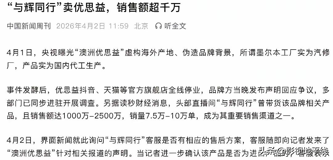 董宇辉这次怎么不说话了?优思益出事后,李若彤、明道都很快回应了,可与辉同行却一直没个说法,客服回得也挺敷衍。不少老粉急了:“宇辉是不是飘了?”但凡董教主有点担当,都不会像这样装死!看看别的带货出问题了第一时间直面问题,反观董文化,虚伪至极! 现在的董宇辉早就很少出现在直播间了,重心更多放在文化内容和公司运营上,不是他不想管,是真的没法每件产品都盯得那么细。 很多主持人,明星代言,保健品还是少吃,这次没踩坑。可已经踩坑的消费者呢?按流程,待国家队定性后,下一阶段才进行市场召回,后续才进行消费者赔偿阶段。与辉同行,该承担责任必须担责,该赔偿必须依法赔偿。