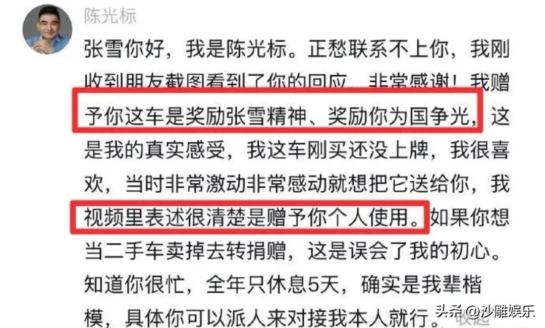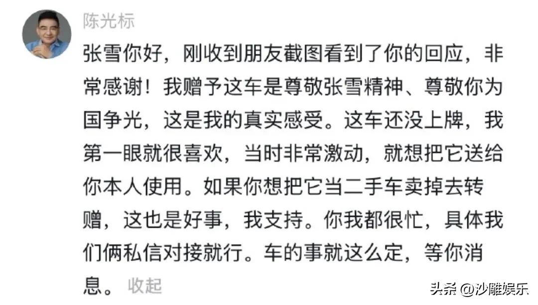 陈光标,彻底坐不住了! 4月2日,陈光标送张雪1300万劳斯莱斯,结果对方扭头就要八折卖了捐给嫣然天使基金。这戏剧性的一幕瞬间引爆热搜, 标哥坐不住了,连夜在评论区发了一段长篇留言,直接把送豪车这事儿给说透了。只能说,这波商界大佬和机车冠军的碰撞,属实是年度大型“误会局”了! 4月1日,慈善家陈光标高调宣布,要把公司刚买的、号称“中国唯一一辆”的2026款加长劳斯莱斯幻影,市场价1300万赠予张雪机车创始人。起因是张雪刚在WSBK葡萄牙站连夺双冠,打破欧美日长达37年的垄断,标哥看得热血沸腾,说这是“为国争光的人值得的最高礼遇”。 结果张雪4月2日凌晨在社交平台回应:“你说儿嚯,那我收了,顺便招募一位附近的2手车商上门8折收了,然后把款捐赠给嫣然天使,我们就委屈点还用面包车接客户。” 好家伙,千万豪车直接变公益基金,这格局属实没谁了。更抓马的是,张雪本人至今连驾驶证都没有——他自己都开不了,不卖还能干啥? 陈光标在评论区给张雪留言:“我赠予你这车是奖励张雪精神、奖励你为国争光,我视频里表述很清楚是赠予你个人使用。如果你想当二手车卖掉去捐赠,这是误会了我的初心。”标哥还特意提到张雪全年只休息5天,是“我辈楷模”,让他派人来对接。 几分钟后,陈光标疑似删除了这条评论,改成:“如果你想把它当二手车卖掉去转赠,这也是好事,我支持。车的事就这么定,等你消息。”这态度反转的速度,堪比赛车过弯——前一秒还在说“你误会了我的初心”,后一秒就变成“我支持你卖车”。网友直呼:标哥你是不是忘了切小号? 据此前报道,张雪虽身价上亿元,却还在用一部屏幕开裂的旧华为手机,生活极度节俭。这次宁愿“委屈点还用面包车接客户”,也不要豪车炫富,跟他之前拒绝新手买大排量车“少死几个人”的安全底线如出一辙,连公安部交通管理局都发文力挺过他。 说实话,这事儿看着有点哭笑不得。两边明明都是好意——陈光标是想给冠军一份实打实的个人奖励,张雪是不想收这么贵重的礼物,想把心意换成公益。一个是“奖励你个人”的赠予逻辑,一个是“取之于民用之于民”的公益逻辑,两条平行线撞在一起,愣是撞出了热搜。 而标哥的“秒删操作”更是点睛之笔——前脚在评论区说“你误会了我的初心”,后脚就删了改成“我支持你”。这波操作,到底是公关团队的紧急救火,还是标哥自己想明白了?反正网友的瓜是管够。 陈光标随即给张雪留言回应“卖车捐款”计划,强调车子还没上牌,是赠予张雪个人使用。如果陈光标最终改变主意决定不再赠送,在法律上他依然有权撤销赠与。这台千万豪车到底能不能变成公益善款,还得看后续交付进度。 目前,这台“中国唯一的2026新款加长劳斯莱斯幻影”已运抵南京,就看后续张雪方面和陈光标如何对接了。 你怎么看?