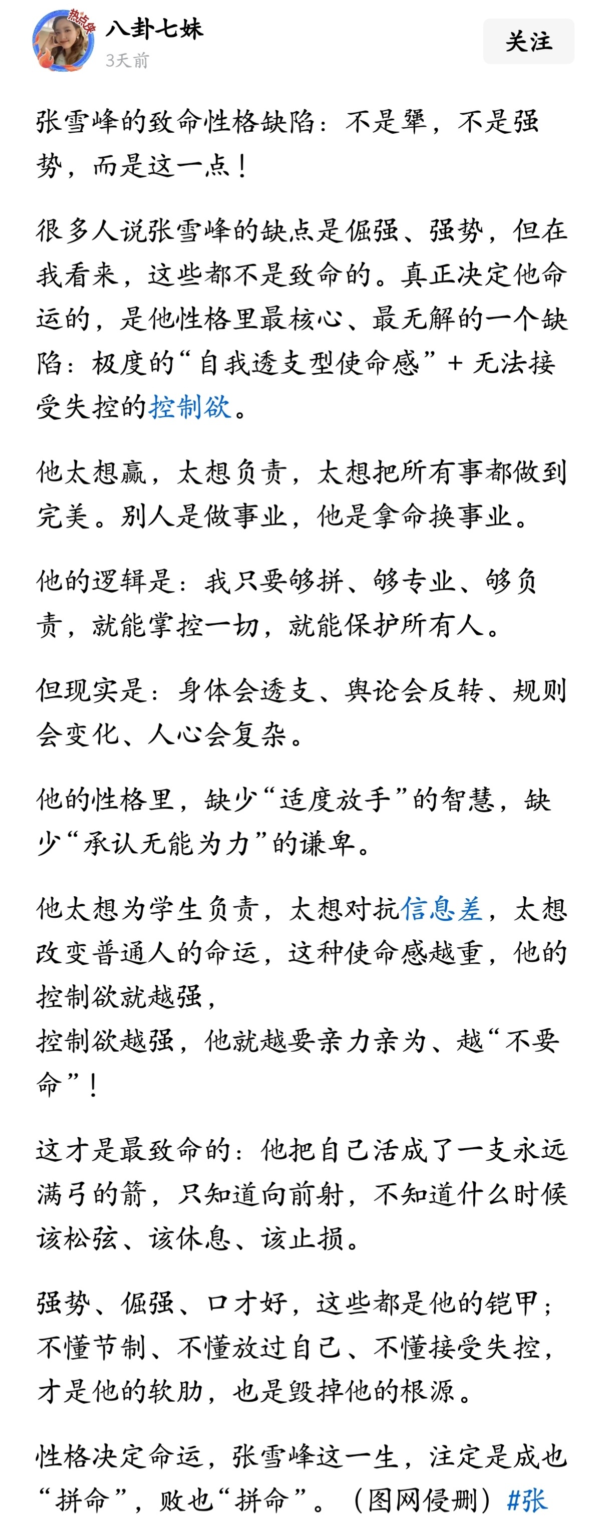 张雪峰的致命性格缺陷,不是犟,不是强势,而是这一点。