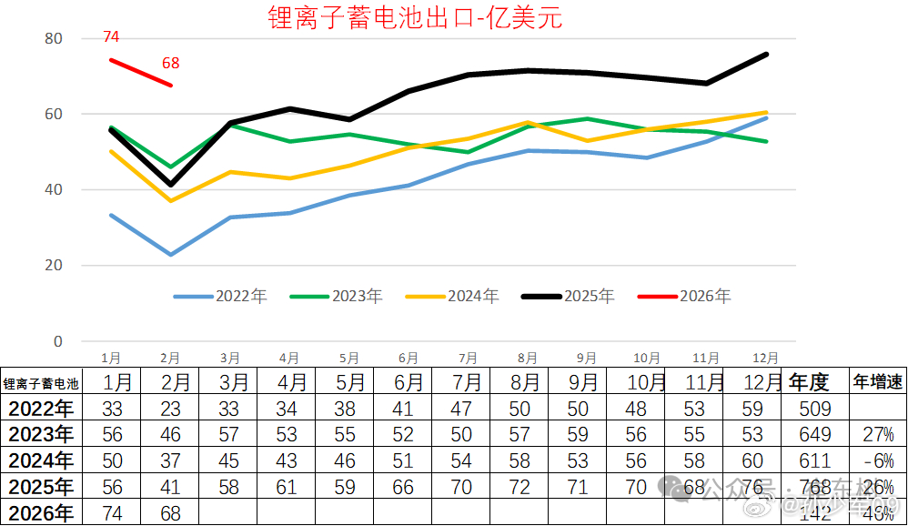 2026年1-2月锂电池出口单价1.53万美元/吨、降10%;出口额142亿美元、增46%