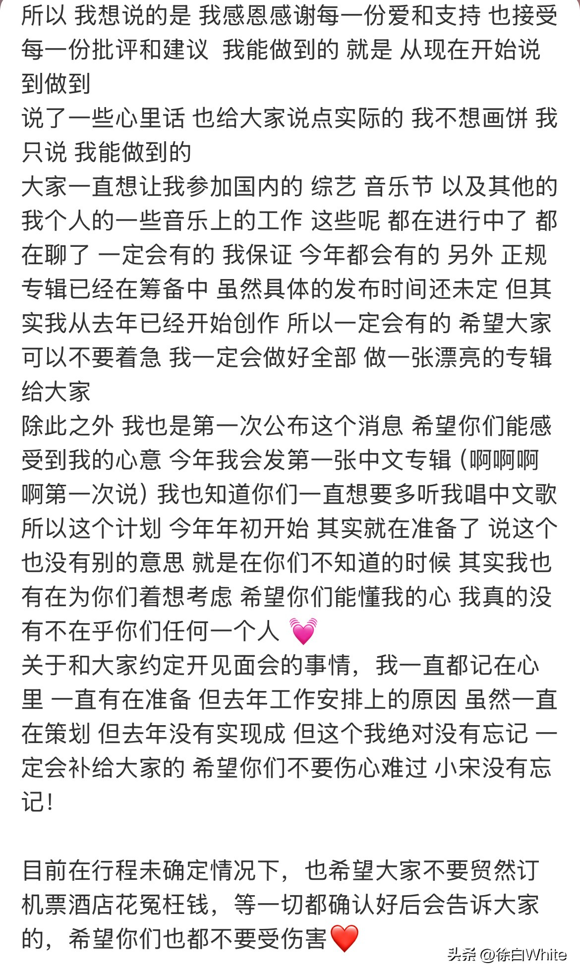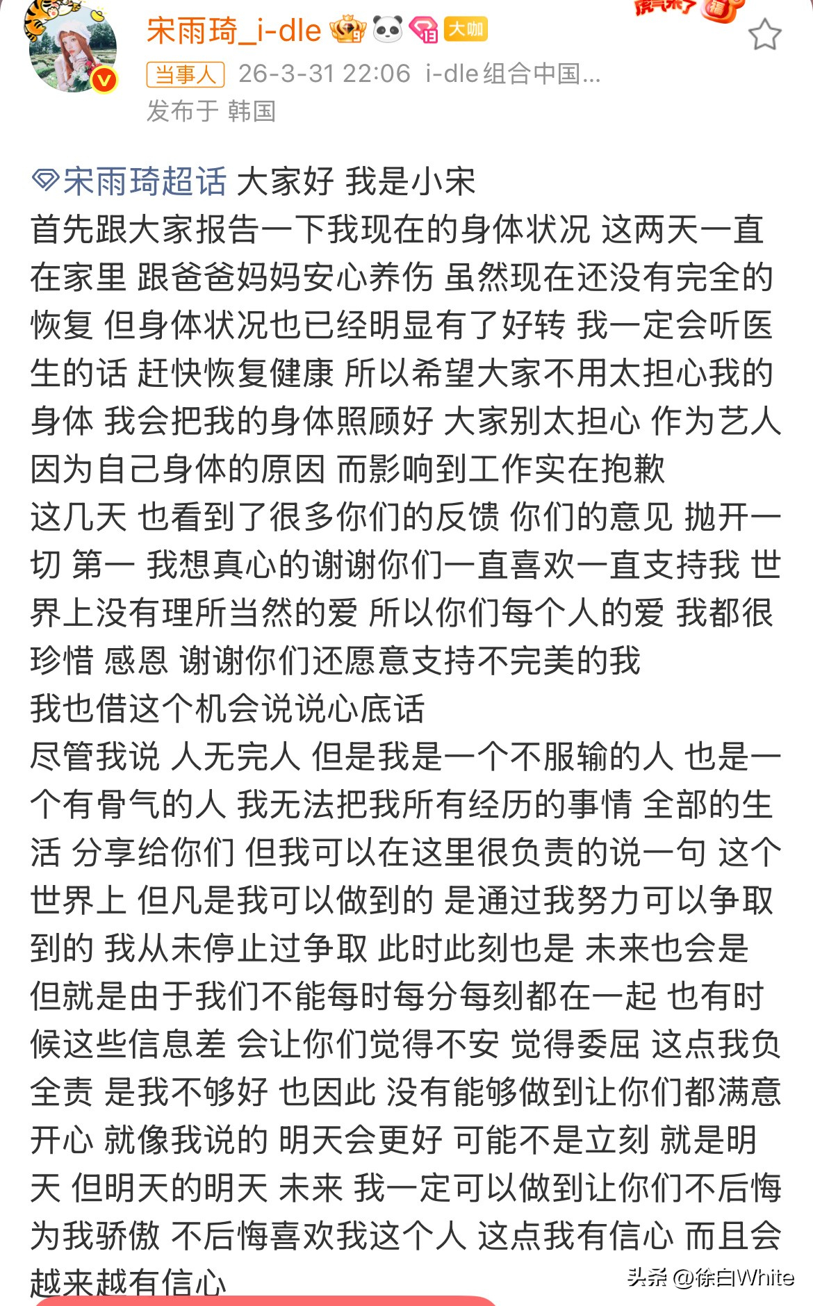 宋雨琦因伤再次缺席跑男录制,发长文维稳,直言目前还没有完全恢复