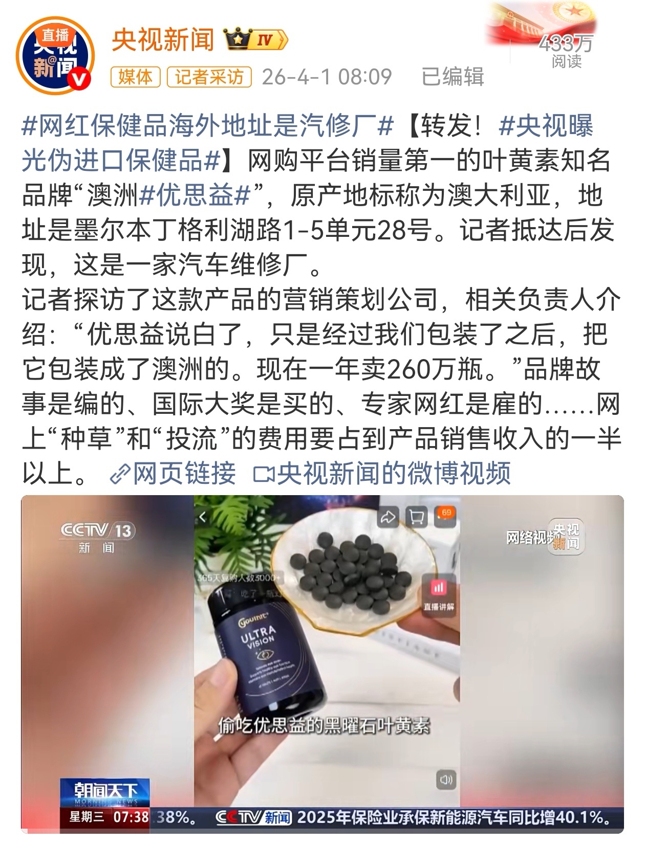 央视实地调查证实,优思益标榜的澳洲生产资质纯属虚构,所谓海外注册公司地址,竟是澳大利亚墨尔本当地一家普通汽车维修站,而产品实际为国内代工生产,彻头彻尾是一场精心包装的进口保健品骗局。