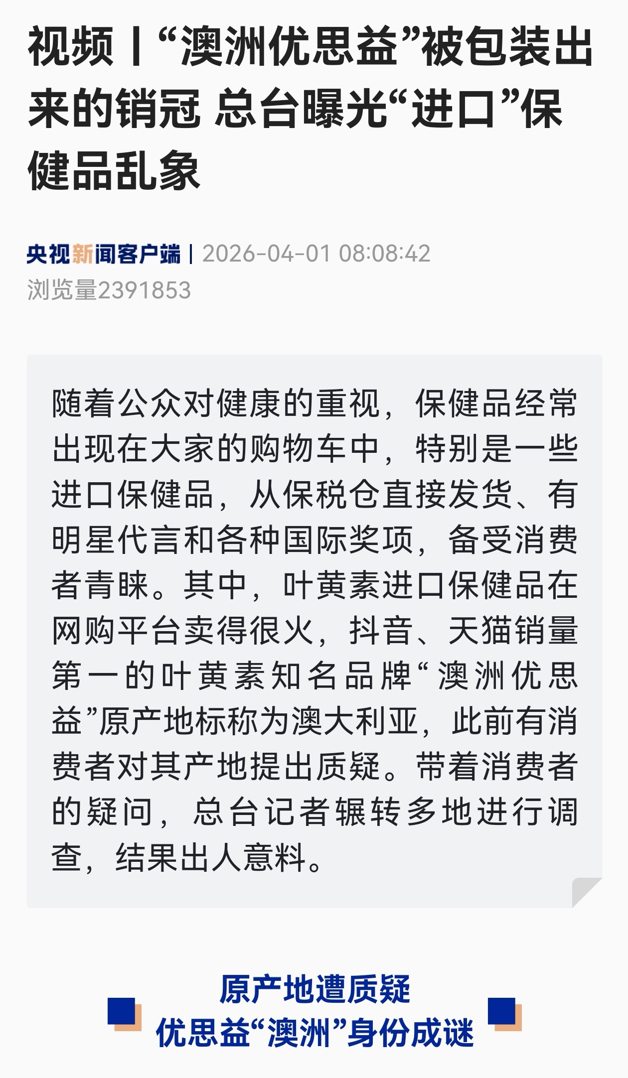 此前,优思益长期以“澳洲本土品牌、原装进口、高品质营养保健品”为营销卖点,在各大电商平台销量火爆,其叶黄素、补铁剂等产品凭借“进口”光环,定价远高于普通国产保健品。