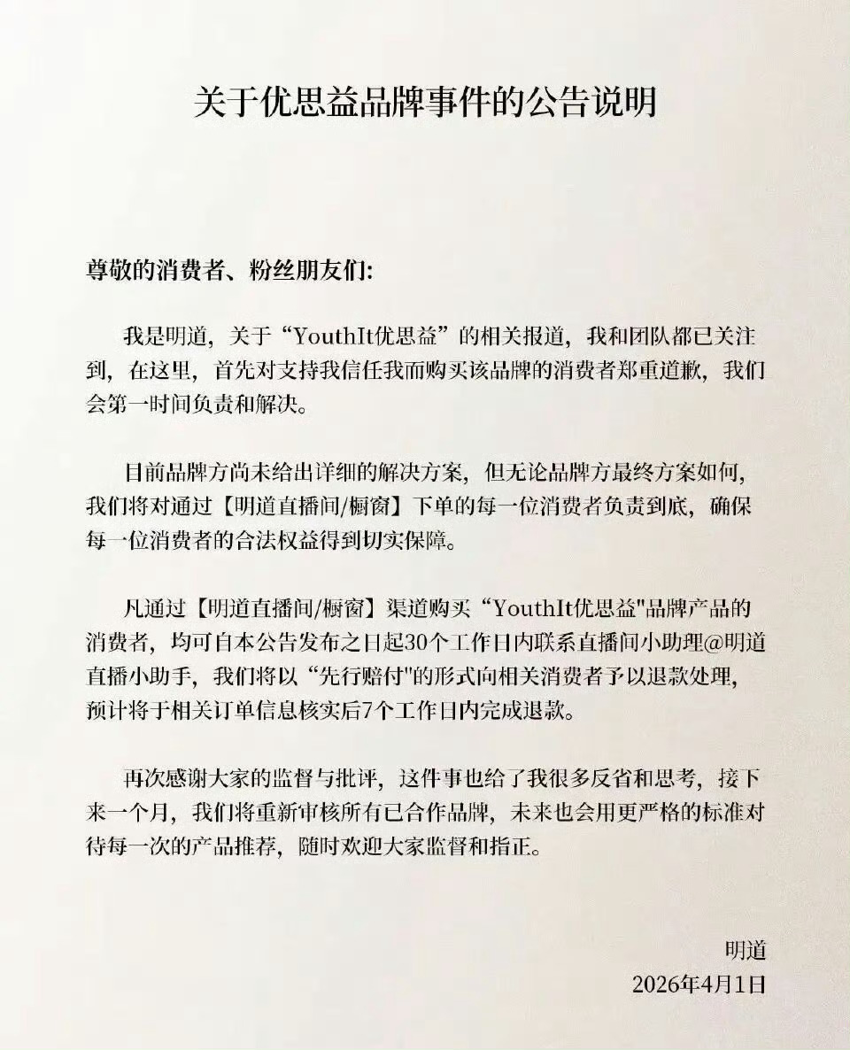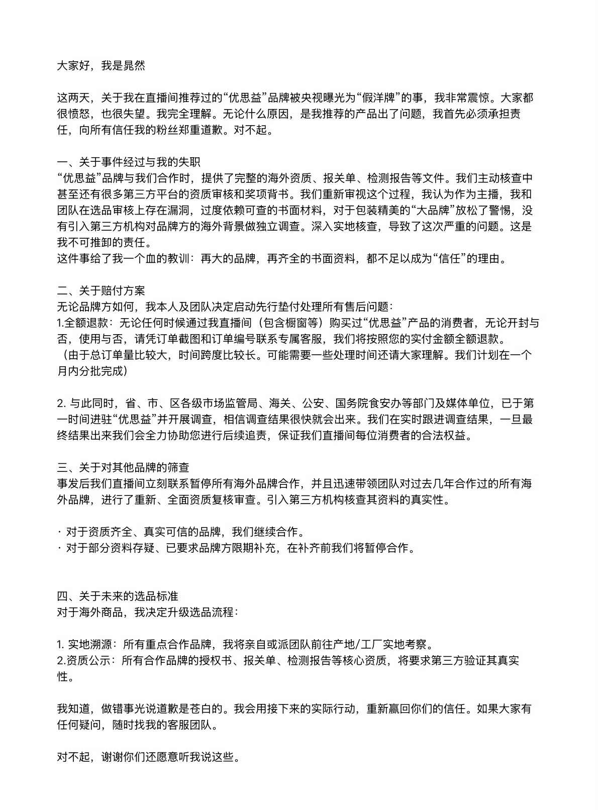 近日,网红品牌“澳洲优思益”被央视新闻曝光为“假洋牌”后,被各电商平台全面下架,曾参与过该品牌推广、带货或宣传的明星、网红,如李若彤、章小蕙、明道等多位艺人相继发布致歉声明,“与辉同行”直播间曾因销售该产品创下千万销售额,主播董宇辉尚不知是否道歉或赔偿。李若彤发布致歉声明优思益