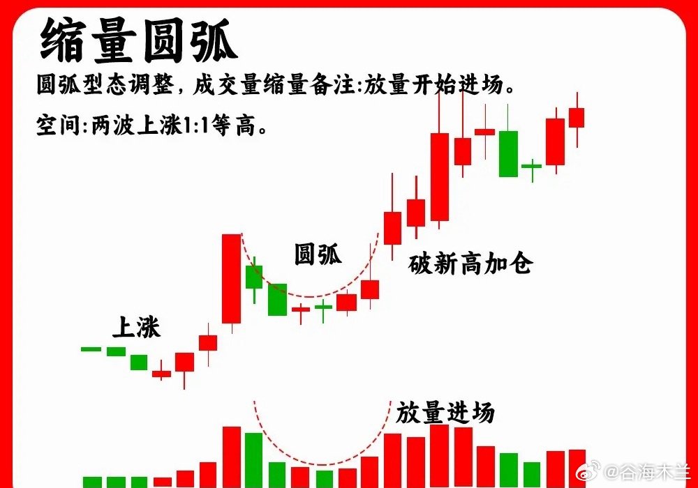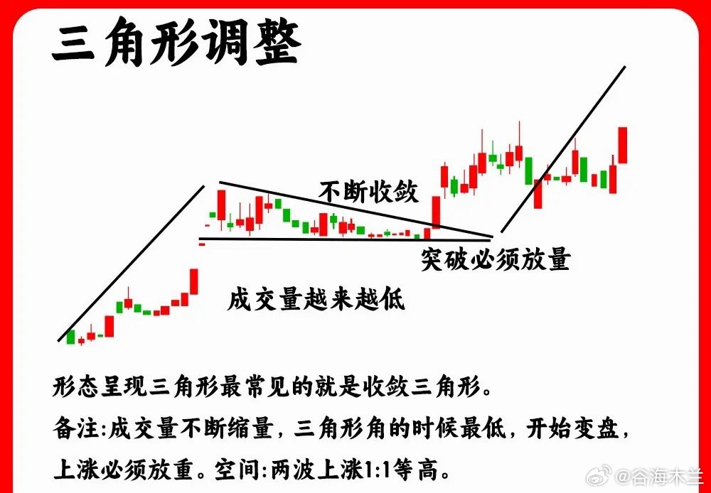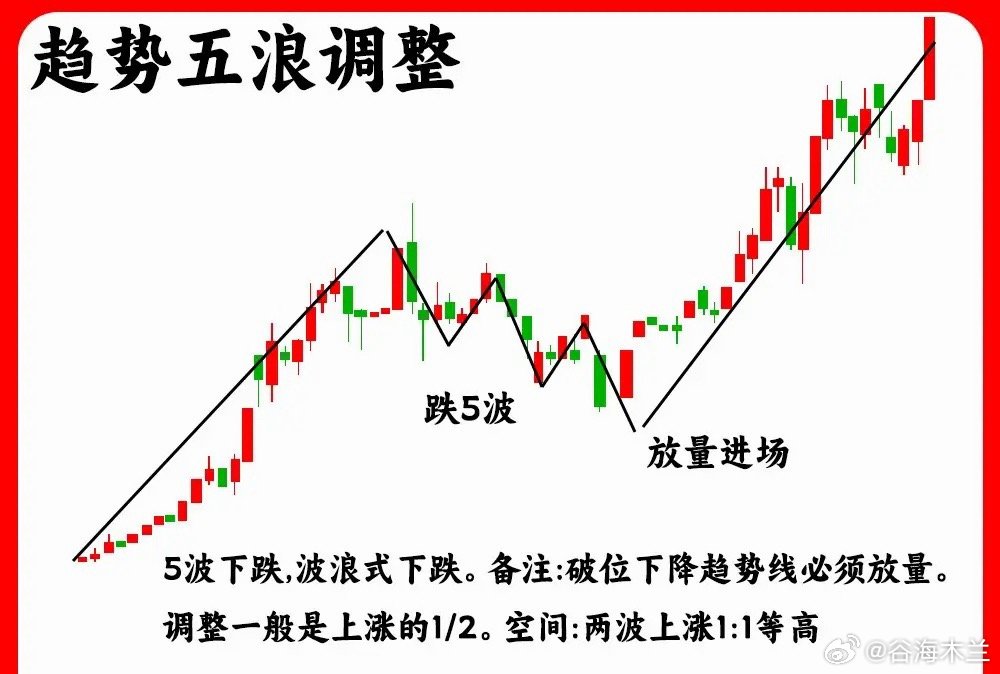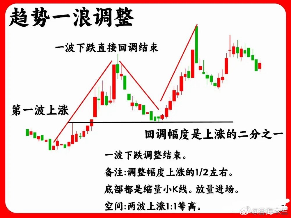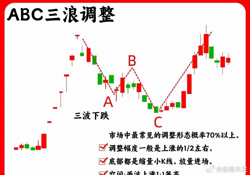 注意了!主力在启动拉升之前或是上涨趋势的中继,往往会出现这六种调整阶段,对于散户来说,波浪理论是最为清楚的,但是这只是一个基础,这六种调整形态才和经典。如果你不打算离开这个市场,那这期内容一定要认真看完还是老规矩,点赞收藏或评论888支持一下,我每天分享炒股干货,以免以后想温习找不到了一、ABC 三浪调整这是上涨趋势里的调整浪,由三条浪组合,第一波下跌,速度比较快,而且成交量会放大,这是抛压比较重的表现,,第二波是反弹浪,一般是开始股价上涨的一半一下,不会突破前期的高点,第三波就是继续下跌,成交量缩量,一般都是小阴线小阳线,也就是常说的阴跌二、趋势一浪调整股价一波上涨以后,随后直线下跌,整个调整阶段,并没有出现反弹迹象,调整的时间周期一般会比较短,调整的幅度一般是上涨的一半位置,往往是强势股的主力洗盘三、箱体震荡这种走势,我们就比较常见了,股价在低位或是中继形成一个箱体走势,股价开始横盘,股价到平台上沿,就开始下跌,股价到平台下沿又会出现止跌企稳,所以股价就在这个箱体里,上下震荡,也是主力筑底洗盘的一个过程,等股价突破平台上沿,说明主力洗盘结束四、三角形调整也叫收敛三角形,股价上涨一波以后,开始盘整。股价涨跌幅开始变小,而且高点开始变低,而低点开始变高,就形成一个三角形。成交量出现逐步缩量,代表着分歧开始变小五、趋势五浪调整股价经历一波大幅上涨以后,随后股价开始下跌,进入一个下跌通道,而在下跌过程里,股价下跌,反弹、下跌,经历五次波浪,高点在降低,低点也在降低,第五浪有一个细节,一般会出现缩量,市场抛压变得很弱六、缩量圆弧调整一波上涨以后,股价开始回调,这个周期往往会比较长,股价慢慢回落,随后慢慢回升得到一个过程,就形成一个股价圆弧形态。一般股价回调,会在上涨阶段一半位置,开始止跌企稳,同时会出现地量出现好了!以上就是我们常见的六种调整浪形态。下方我准备了对应的案例图,建议把案例图牢记在心里。希望对大家有启发,也是最为基础的内容,一定吃透。我们下期内容再见