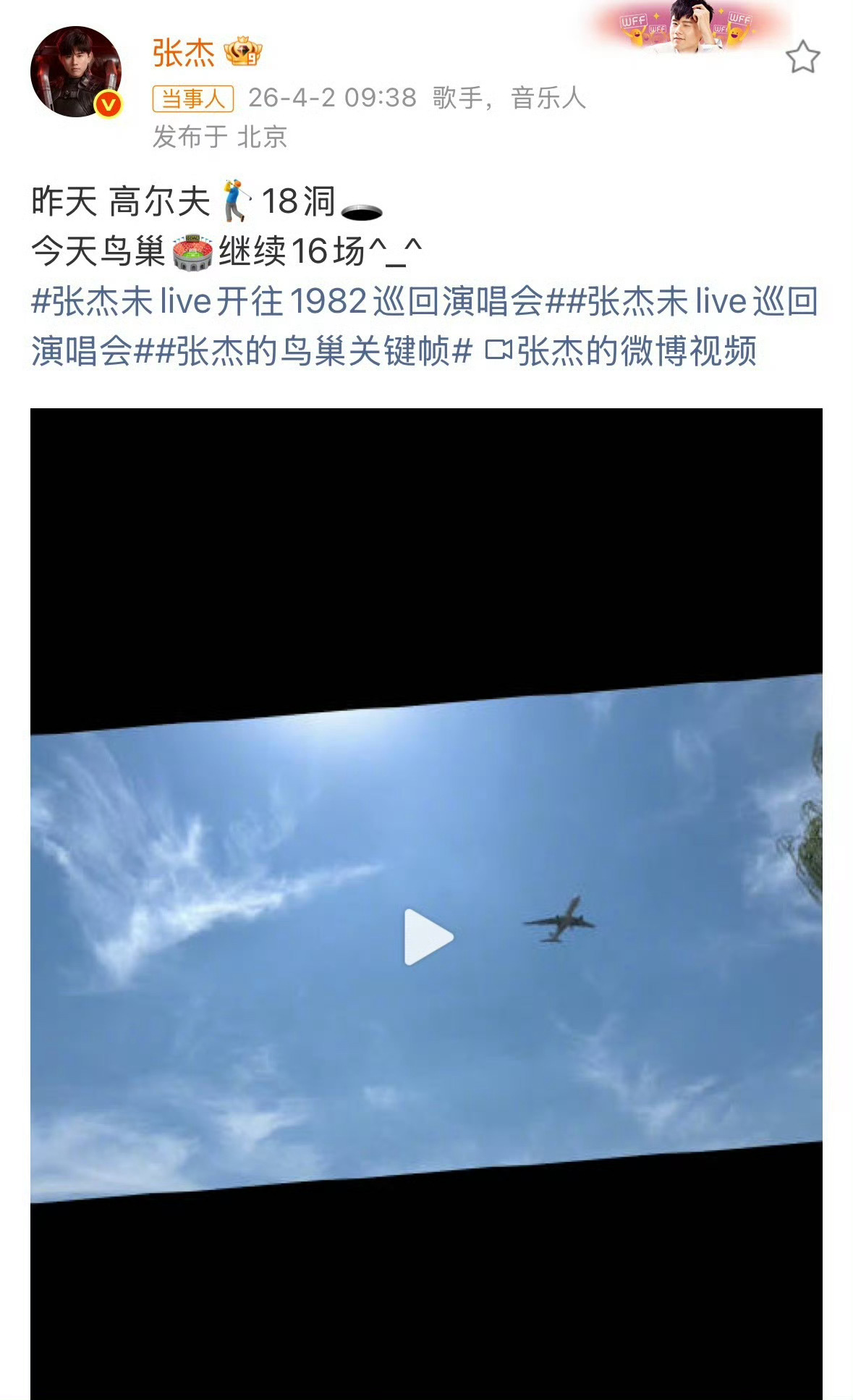 张杰今天鸟巢继续16场超级高能量的杰哥,昨天高尔夫今天演唱会,运动工作两不误太夯啦!