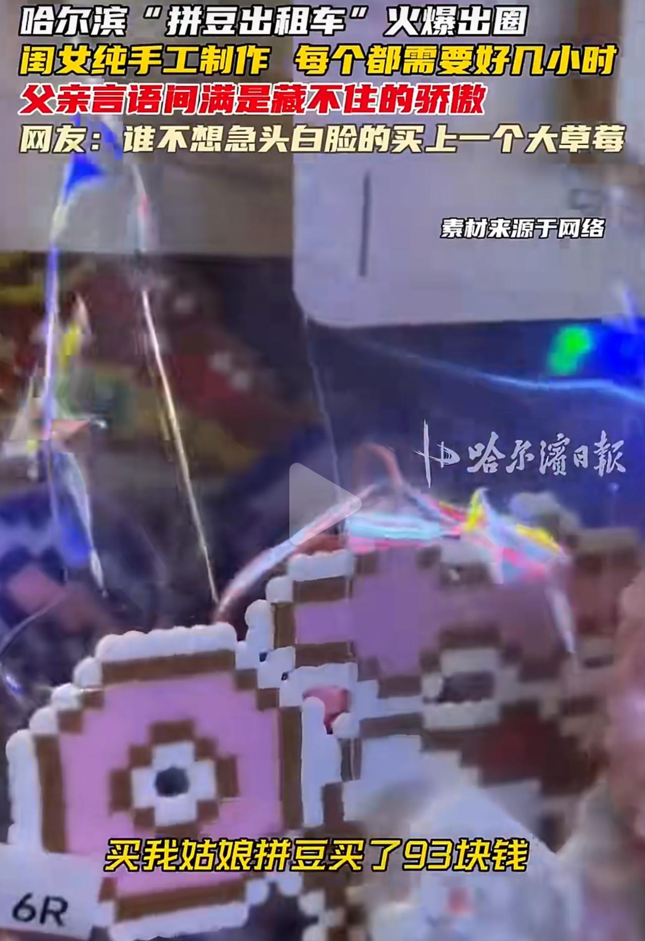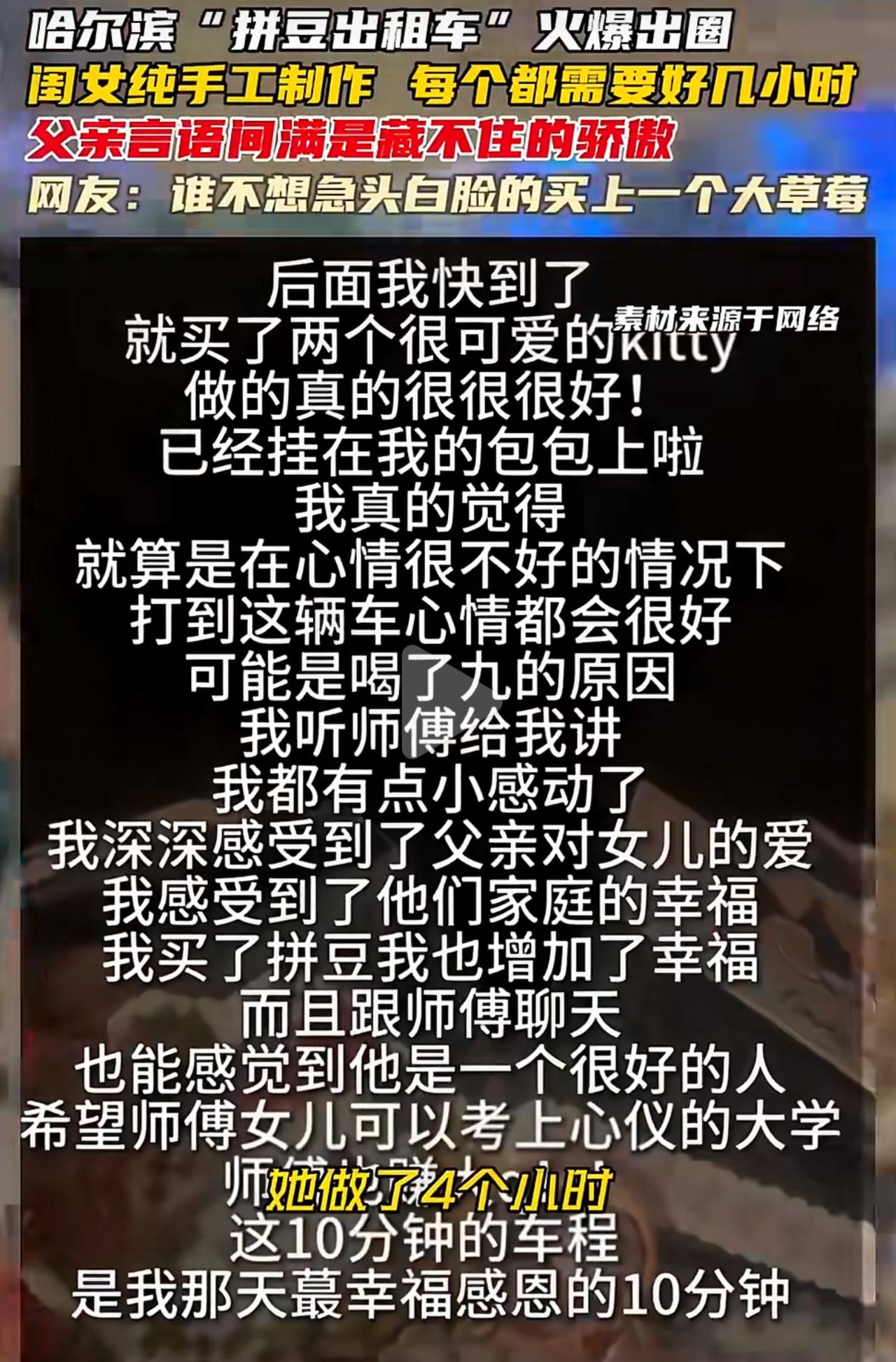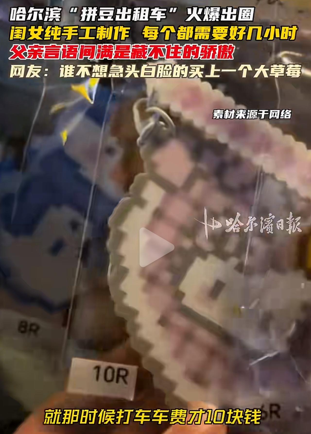 哈尔滨一位开出租车的爸爸,把自己的车变成了女儿的移动手作铺。上高中的女儿没事就做拼豆挂件,一个小草莓要耗6小时,蓝莓也要4小时,就连做坏了的,爸爸都舍不得扔,全都好好收着。 乘客买下那单的时候,爸爸笑着说自己心态崩了,可转头就认认真真拍好照,就怕女儿晚上问起来,他说不清楚。卖手工的钱,他一分不留,全都给女儿。嘴上说着被碾压,脸上的得意劲儿,谁都看得出来。 他从来没说过做手工耽误学习,也没天天盯着成绩逼孩子。女儿喜欢,他就全力支持,开着车满大街帮着展示、帮着卖。 不少网友都说,那93块买的根本不是小挂件,是被好好捧在手心里的热爱,是最细腻、最温柔的父爱。 现在太多家长,张口闭口就是分数、排名,可这位爸爸用最朴素的方式告诉我们:看见孩子的喜欢,比什么都重要。 这哪里是做生意,明明就是父爱和梦想的双向奔赴。平凡的日子,因为这份用心,真的太暖了。拼豆 拼豆出租车 老爸收入不敌女儿卖拼豆直呼崩溃