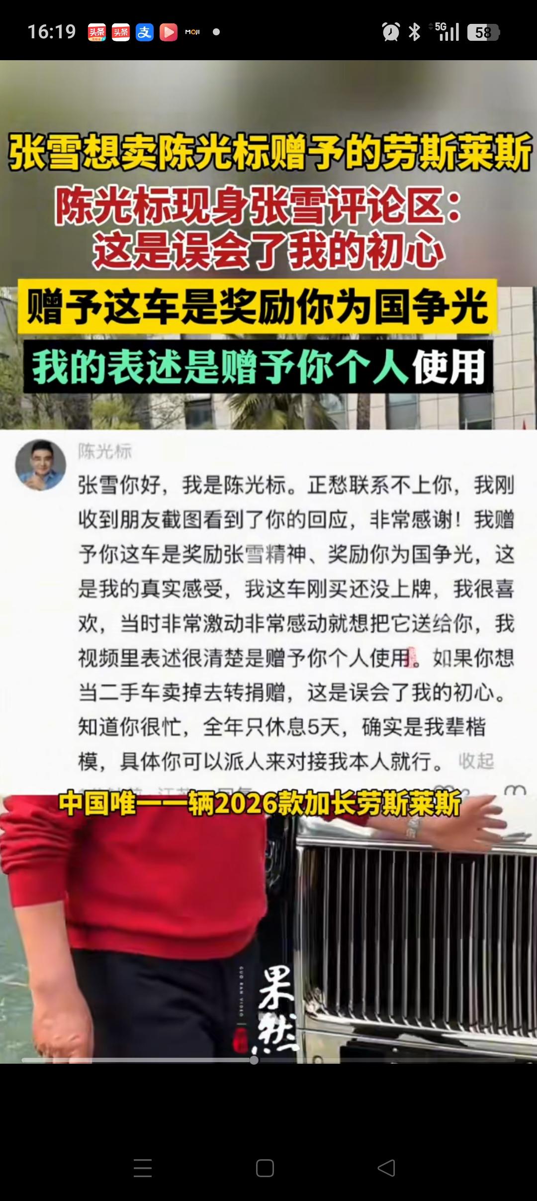 真是高手过招啊![捂脸] 陈光标:1300万的莱斯劳斯送给你。 张雪:我要了,但我把它卖了捐出去。 陈光标:你理解错了,我说的是给你用。 这个事只怪标哥一开始没说清楚,只说赠予,并没有说是送给他,还是给他使用。 所以后来张雪才开玩笑,说是他要了,但是会捐出去。 如果是真的想帮助张雪,我觉得标哥应该买几辆张雪机车就好。不管是送人还是自己开,都是自己的一份心意。 作为张雪,他也不会拒绝,心里还会感激。送车的事就算了吧。