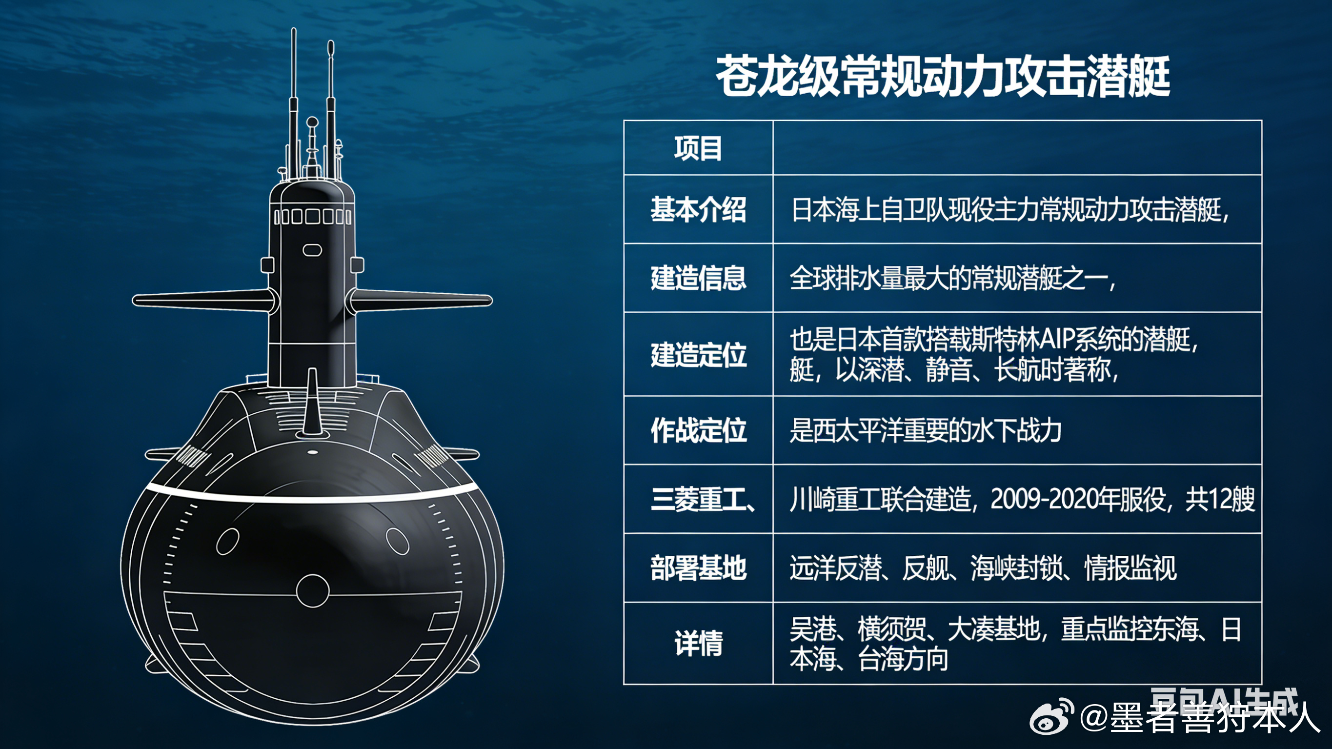 军事Ai新视野 日本苍龙级潜艇是日本海自现役主力常规攻击潜艇,全球排水量最大常规潜艇之一,首款搭载斯特林AIP系统,凭深潜、静音、长航时,成为西太平洋核心水下战力全球武器装备盘点