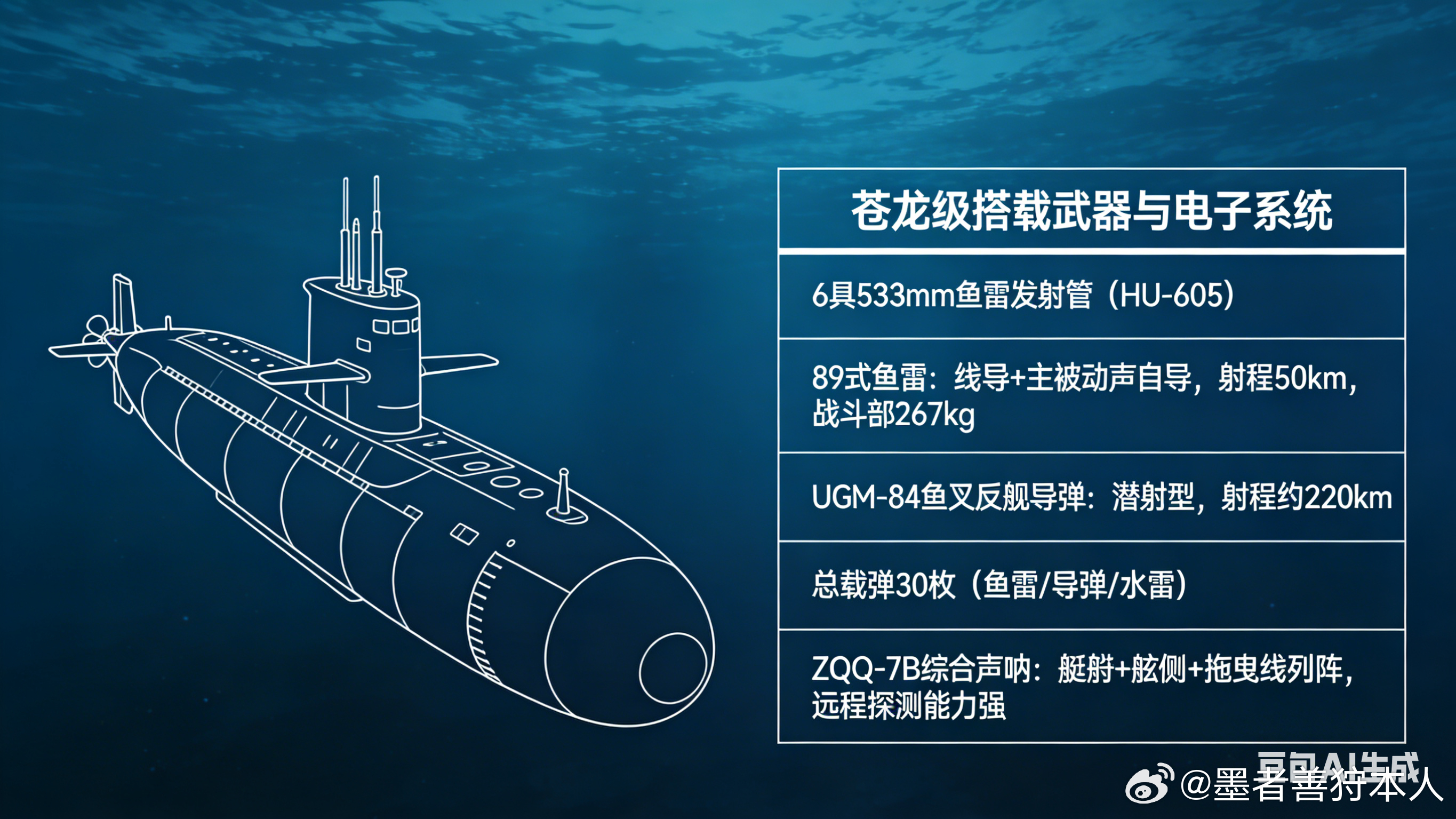 在武器方面,苍龙级搭载6具533mm鱼雷发射管,搭载89式鱼雷(射程50km)、潜射鱼叉导弹(射程220km),总载弹30枚;ZQQ-7B综合声呐,远程探测能力突出。