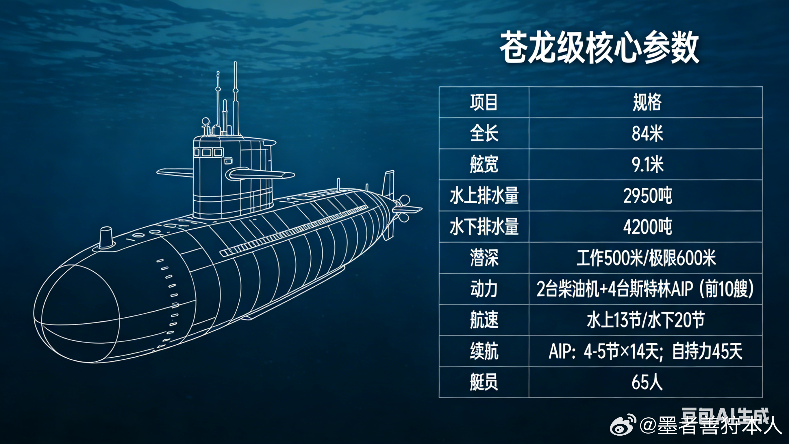 苍龙级全长84米,水下排水量4200吨,潜深极限600米;前10艘配2台柴油机+4台斯特林AIP,水下低速潜航2周不上浮,第11艘起换装锂电池,潜航时间提升45%。