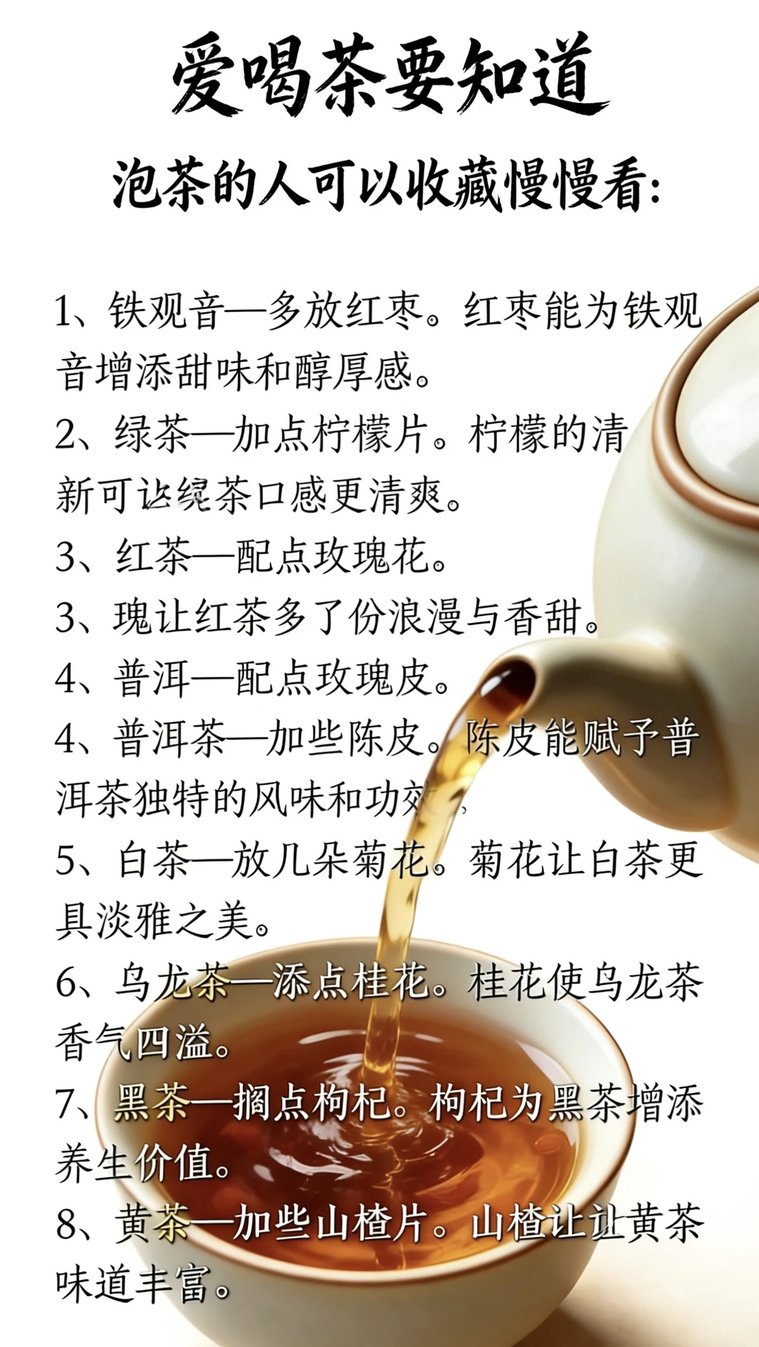 这8种搭配口诀,兼顾口感与养生,不管是自己日常饮用,还是招待亲友,都能轻松泡出好喝的茶饮,让饮茶时光不再单调,爱茶之人快收藏起来,慢慢尝试吧!