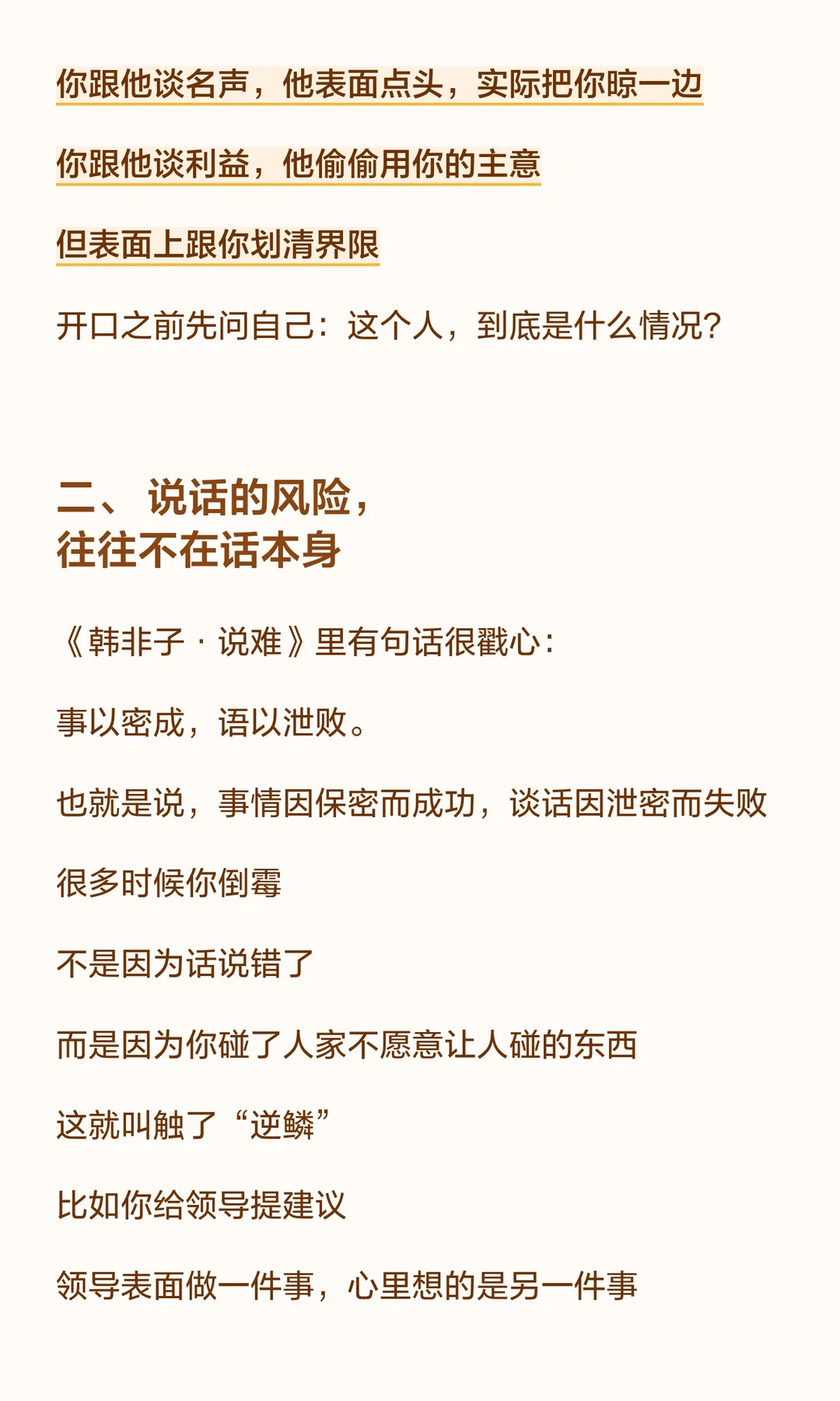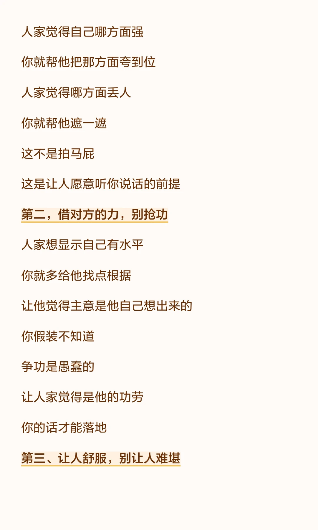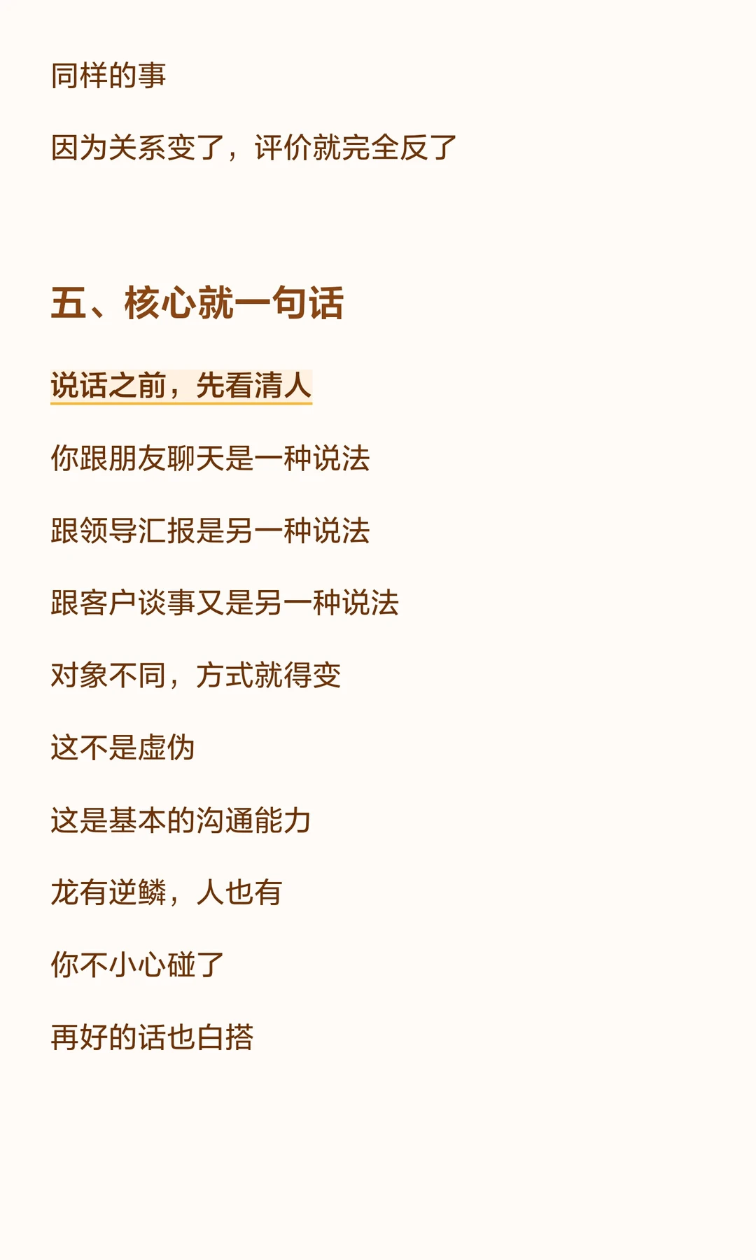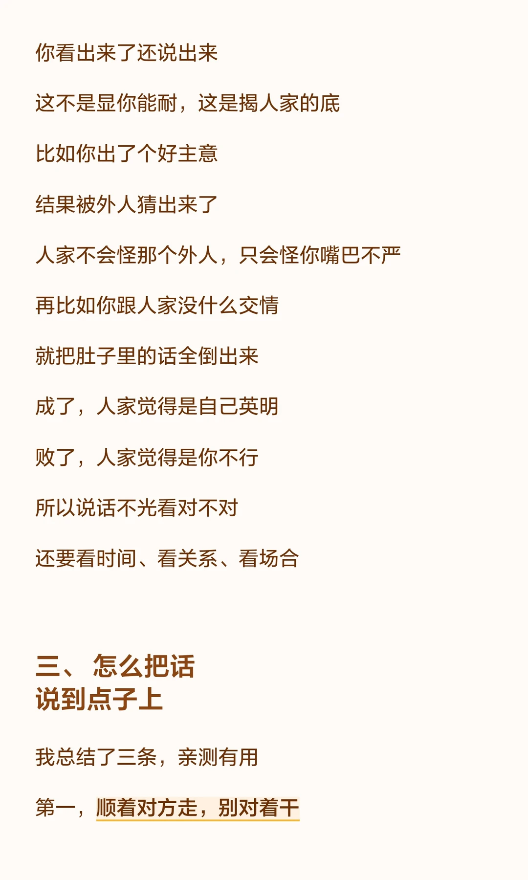 说话的艺术在于时机、场合和对象。 先了解对方需求,顺着对方走,借力使力,避免触碰“逆鳞”。 毛选里的“看菜吃饭,量体裁衣”同样适用于沟通,确保话说到点子上,效果事半功倍。