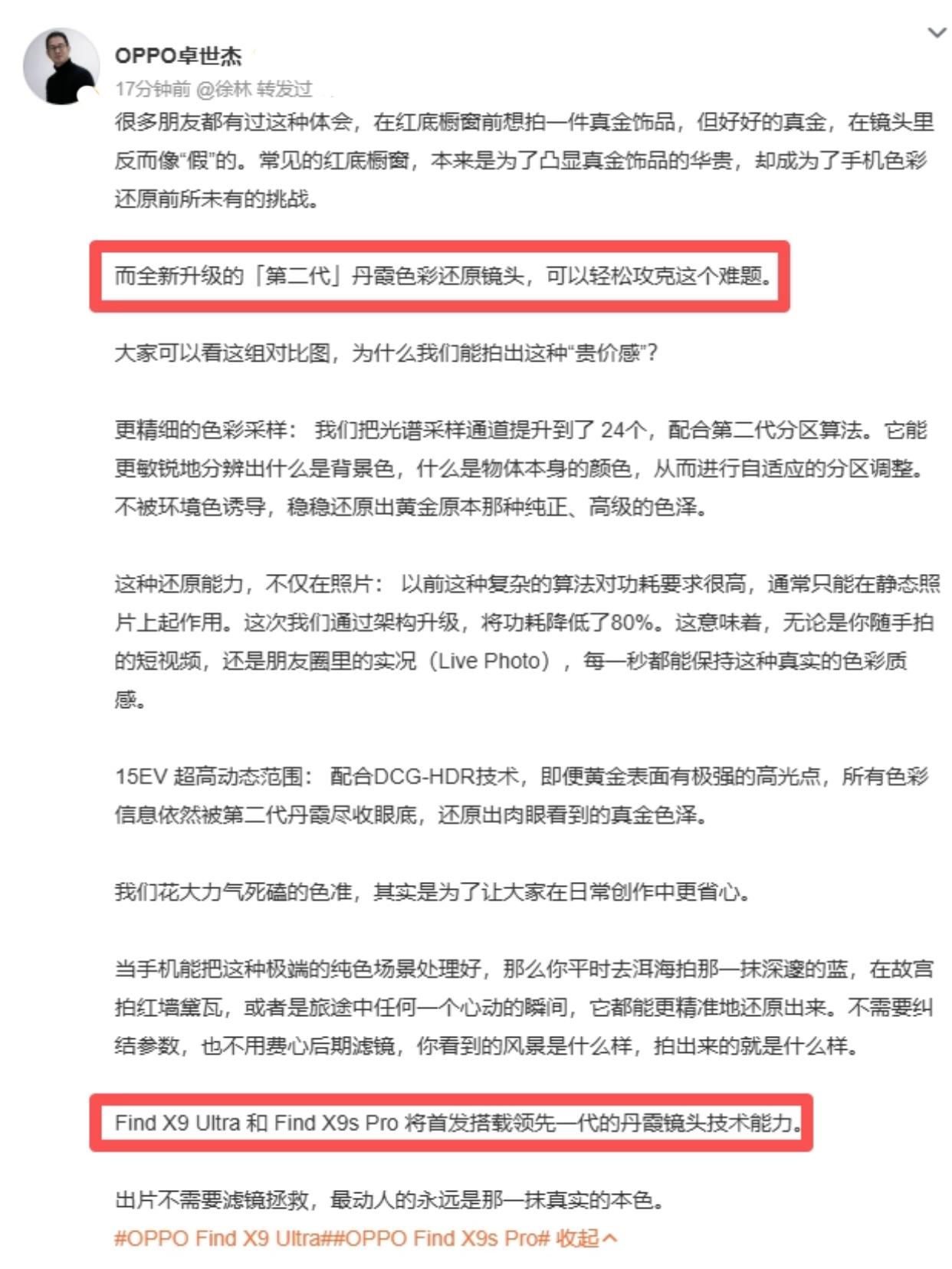 好家伙,不同手机拍金子区别如此大 一觉睡醒,黄金怎么又跳水了!按理说不应该啊,为啥啊,我是真没招了!有没有人昨天逃顶了,分享下心得呗。。。 - 金子这玩意真是让人又爱又恨啊,买不买是一回事,刚刷到个很有意思的,原来不同手机拍黄金出来的效果差这么多! - 看到别人发的,其它手机拍出来的黄金跟“假”的一样,发白。有OPPO拍出来的黄金,就有这种贵价感,差别真的好大 - 查了下,说是OPPO Find X9s Pro拍的,这款跟Find X9 Ultra一样,都有第二代丹霞色彩还原镜头,色准更好,所以才能还原真实黄金的颜色 - 感觉有点东西啊这两台新手机,据说都有哈苏双两亿,X9U更牛还有10倍光学变焦的内置增距镜实力……X9s Pro则是同档唯一双两亿,媲美别家的新Ultra,平时拍照很容易就是眼睛看是一回事,实际拍出来又是另一回事,能还原肉眼看到的颜色,那平时出去旅游拍风景、拍人,效果应该也会更好。 - 蹲蹲看4月21日OPPO的发布会,到时看看这两款新机还有啥看点! 黄金 黄金跳水 OPPO 手机拍照 国产手机 OPPOFindX9Ultra OPPOFindX9sPro 数码科技