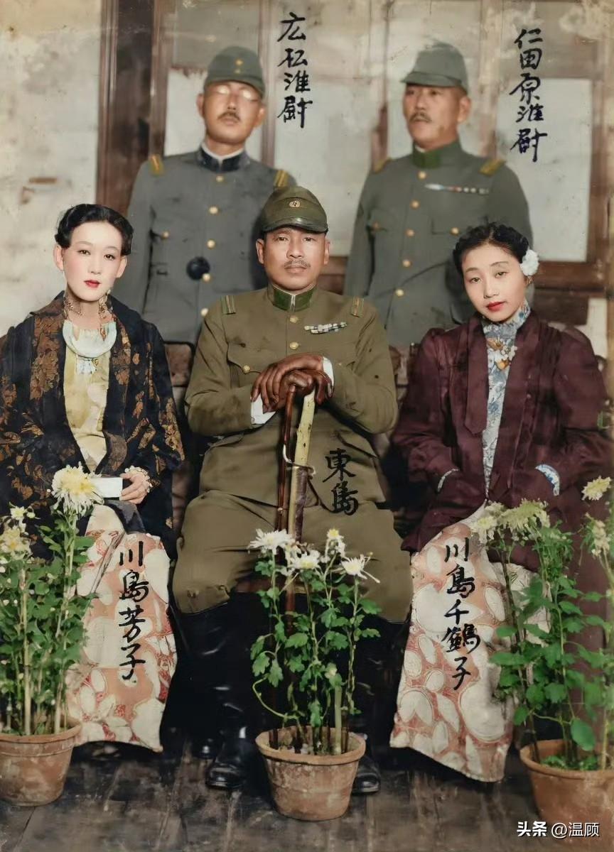 这张拍摄于1937年天津日租界的彩色照片,定格了“男装女谍”川岛芳子一段鲜为人知的历史瞬间。照片中的每一个人物,都是日本侵华机器上的一枚齿轮,共同构成了那个时代黑暗的缩影。 照片的核心人物,左侧端坐的女子,正是川岛芳子(爱新觉罗·显玗)。作为前清肃亲王之女,她自幼被送往日本,被养父川岛浪速培养成一名军国主义间谍。在公众印象中,她总是以一身男装示人,冷酷而干练。而这张照片,却是她极为罕见的以女装公开亮相的影像。她身着带有华丽纹样的和服式外褂,妆容精致,神情平静,与身旁的日军军官同框,这种反差恰恰暴露了她作为间谍的多面性——为了伪装,她可以随时切换任何角色。 她此次回到天津,正值1937年“七七事变”之后。在日军华北方面军的安排下,她以经营饭庄为名,在日租界的松岛街(今和平区哈密道)开设了著名的东兴楼。这座表面主营鲁菜的高级饭庄,实则是日军的秘密情报据点。她以“女老板”的身份为掩护,在这里策动阴谋、传递情报、拉拢汉奸,成为当时华北地区最活跃的情报中心之一。 照片右侧,陪伴在她身边的是她的贴身侍女与助手川岛千鹤子。她不仅是川岛芳子生活上的照料者,更是其情报活动中的得力助手,负责传递消息、打理饭庄事务,见证了东兴楼里发生的一切秘密勾当。 坐在正中的,是当时驻天津的日军军官东寿,他是川岛芳子在日军中的直接联络人之一,也是东兴楼情报网的关键人物。照片后方站立的两名军官,标注为广弘准尉与仁田原准尉,他们都是当时华北驻屯军的基层军官,是川岛芳子日常打交道、获取情报渠道的一部分。这些军官的存在,印证了东兴楼与日军官方的深度绑定。