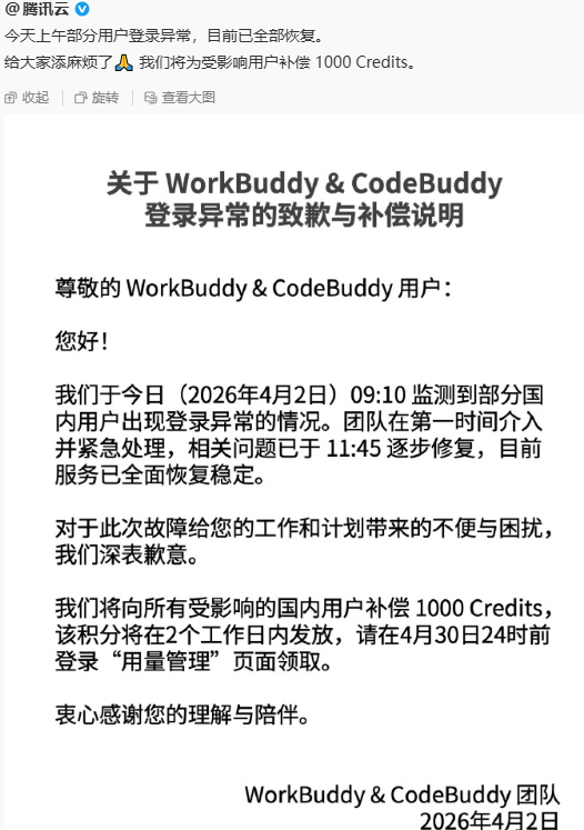 腾讯WorkBuddy崩了 最近ai服务器蹦得挺多的,DeepSeek最近崩了几次,腾讯的WorkBuddy竟然也崩了,背后的原因无非就是Token需要量爆发太块,基础算力建筑跟不上~~