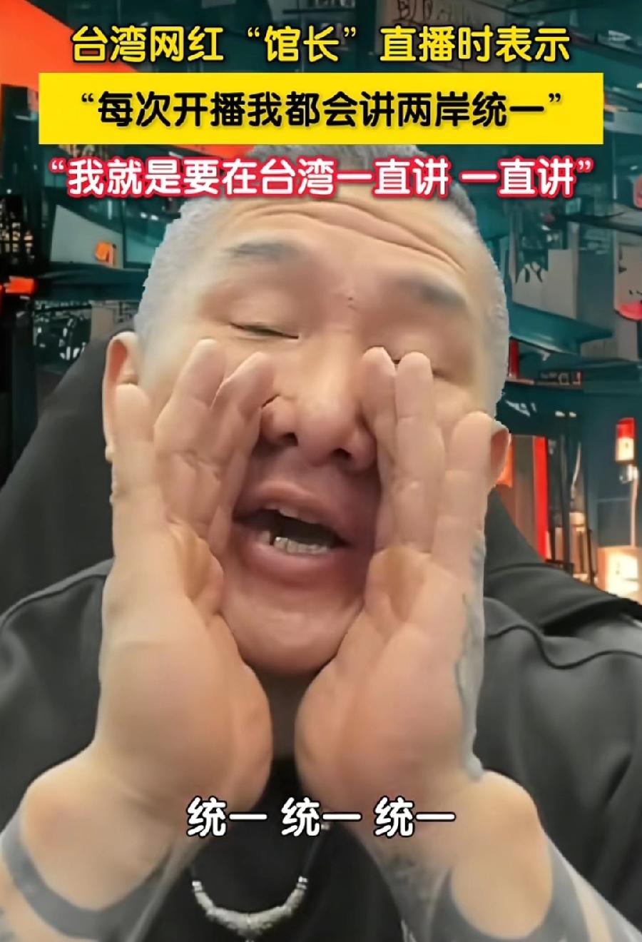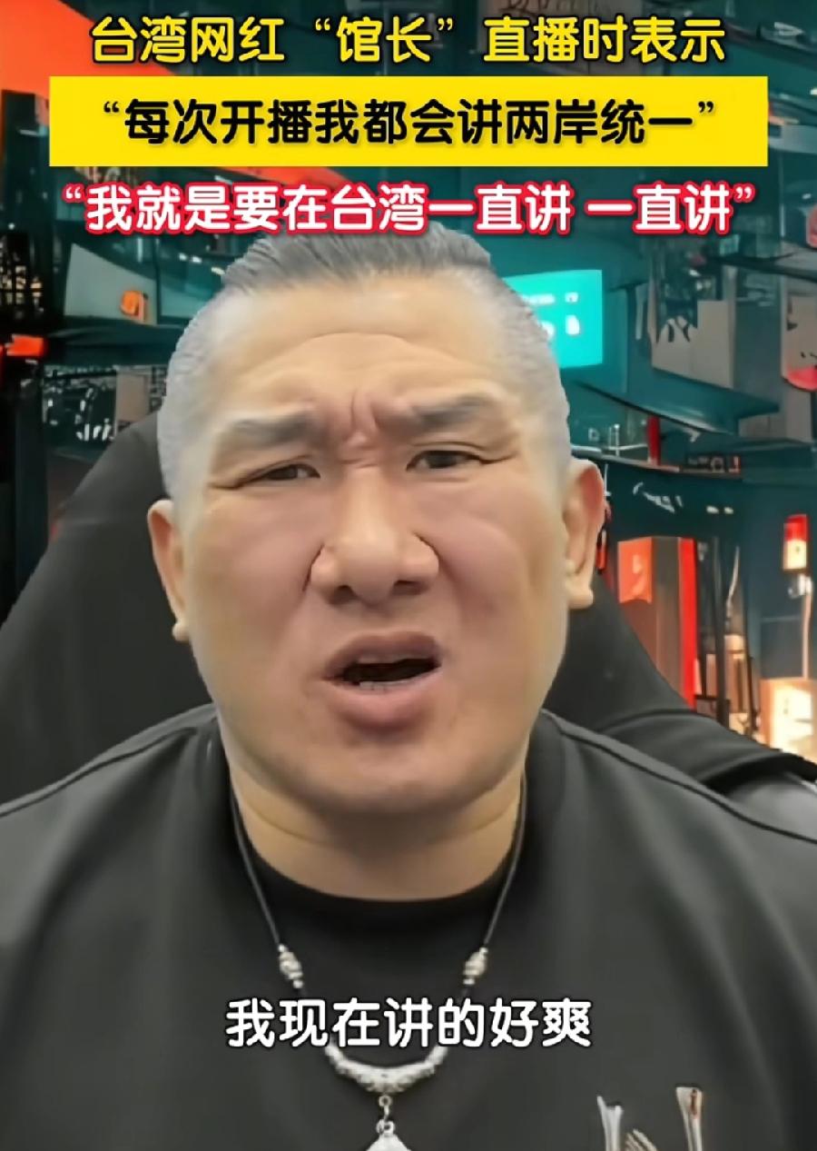 台湾馆长,绝对是台湾支持统一民间第一人,每次直播时都要喊统一,说喊得好爽,可见发自肺腑真心想统一,还说统一成功不必在我、成功必定有我,和平统一最好,万一武统,馆长当过兵,还是军官,如今健身教练,打仗绝对没问题,到时可以加入解放军!