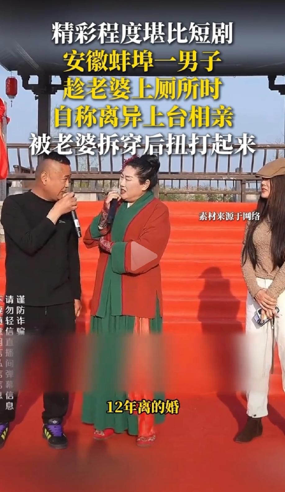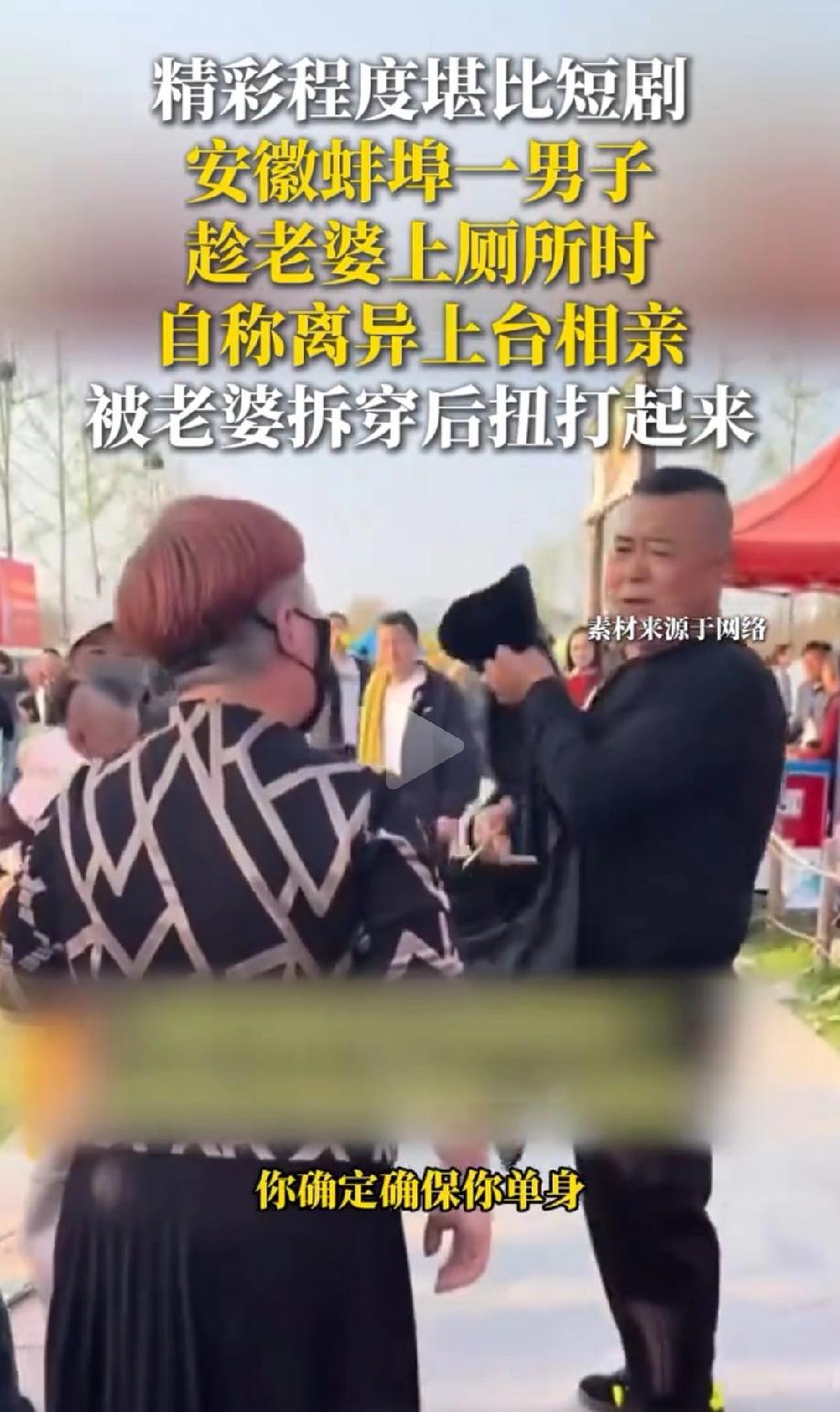 男人只有挂在墙上才老实!安徽蚌埠,51岁男子看到王婆说媒现场非常热闹,台上的女嘉宾更是他心仪的对象,于是趁着妻子去上厕所的间隙,他签下单身协议,上台参与相亲,还自称离异带两娃。没想到,相亲还没结束,妻子就返回现场,被当场抓包后,男子又一口咬定他没结婚。这话彻底惹怒了妻子,两人扭打在一起 闹的不可开交,甚至惊动了民警。 据悉,4月1日,安徽蚌埠固镇樱花园的“王婆说媒”活动现场,人气格外旺盛。 51岁的男子老周也跟着妻子来凑凑热闹,本是陪着妻子逛逛。 老周的目光不经意扫过台上一位女嘉宾时,他的心瞬间被勾了过去,女嘉宾的模样,正好是他心仪的类型。 老周心里打起了小算盘,要是能上台跟这位女嘉宾说上话,说不定就能有新的缘分。 他偷偷瞄了一眼,发现妻子正好要去洗手间,这可是个绝佳的机会。 他没多想,趁着妻子离开的空档,快步走到舞台边,按照活动要求,签下了那份“单身协议”,随后便迫不及待地跳上了台。 上台后,老周对着台下观众和主持人侃侃而谈,直接自称是离异状态,还说自己带着两个孩子,曾经也辉煌过。 一番话引得台下不少人关注,他还直言自己这次上台,就是奔着台上那位心仪的女嘉宾来的。 看着台上的自己,老周心里还有点小得意,觉得这波操作很稳,没人会发现他的真实情况。 可没成想,闹剧很快就上演了。 老周的妻子从洗手间回来,一眼就看到台上的丈夫,瞬间愣住了,丈夫去台上相亲,这不是司马昭之心,路人皆知嘛。 妻子气的牙痒痒,当场就不顾脸面,拆穿老周的假单身。 老周被妻子抓个正着,心里慌了神,但嘴上却硬撑着,不仅不承认自己有家室,反而指责妻子:我不想要她,我没跟她结婚! 这句话彻底点燃了妻子的怒火,她没想到丈夫竟然敢在大庭广众之下撒谎,还说出这么伤人的话。 妻子当场就跟老周扭打在了一起,一边哭一边骂,周围的围观群众也纷纷指责老周的行为,这么做实在太令人不齿了。 相亲现场瞬间乱作一团,王婆也被这突发状况气得够呛,谁能想到,有家室的老周还能这么恬不知耻,站到台上偷偷相亲。 为了避免事态进一步升级,民警很快赶到现场,将两人带走进行调解。这场荒诞的相亲闹剧,最终草草收场。 好好的一场相亲活动,被老周的荒唐行为搅得一团糟。 婚姻需要忠诚,任何欺骗和背叛的行为,最终都只会自食苦果,老周如此背叛婚姻,可想而知,这段感情也不会幸福。 首先,老周的行为已经违反了夫妻忠实义务。 《民法典》第1043条第2款明确规定:夫妻应当互相忠实,互相尊重,互相关爱。 老周已婚却冒充单身,还签单身协议相亲,这属于公然背叛婚姻,严重违反忠实义务,由不得妻子不生气。 若后续因此离婚,妻子可主张老周为过错方,要求损害赔偿。 老周被抓包后,两人打架的行为属于互殴,而且严重扰乱公共秩序。 《治安管理处罚法》第43条规定:殴打他人或故意伤害身体的,处五日以上十日以下拘留,并处二百元以上五百元以下罚款。 老周和妻子两人在公共场所扭打,不仅扰乱活动秩序,更是一种互殴行为。 民警一旦调解不成,可以依法对双方或单方予以治安处罚,老周这次恐怕还要面临拘留或者罚款的处罚。 婚姻不易,且行且珍惜。老周作为家里的顶梁柱,更应该好好疼爱妻子,而不是选择背叛婚姻。 如果真的不爱了,完全可以好聚好散,协议离婚、和平分手,何必要闹得这么满城风雨,丢尽最后一丝尊严和脸面。
