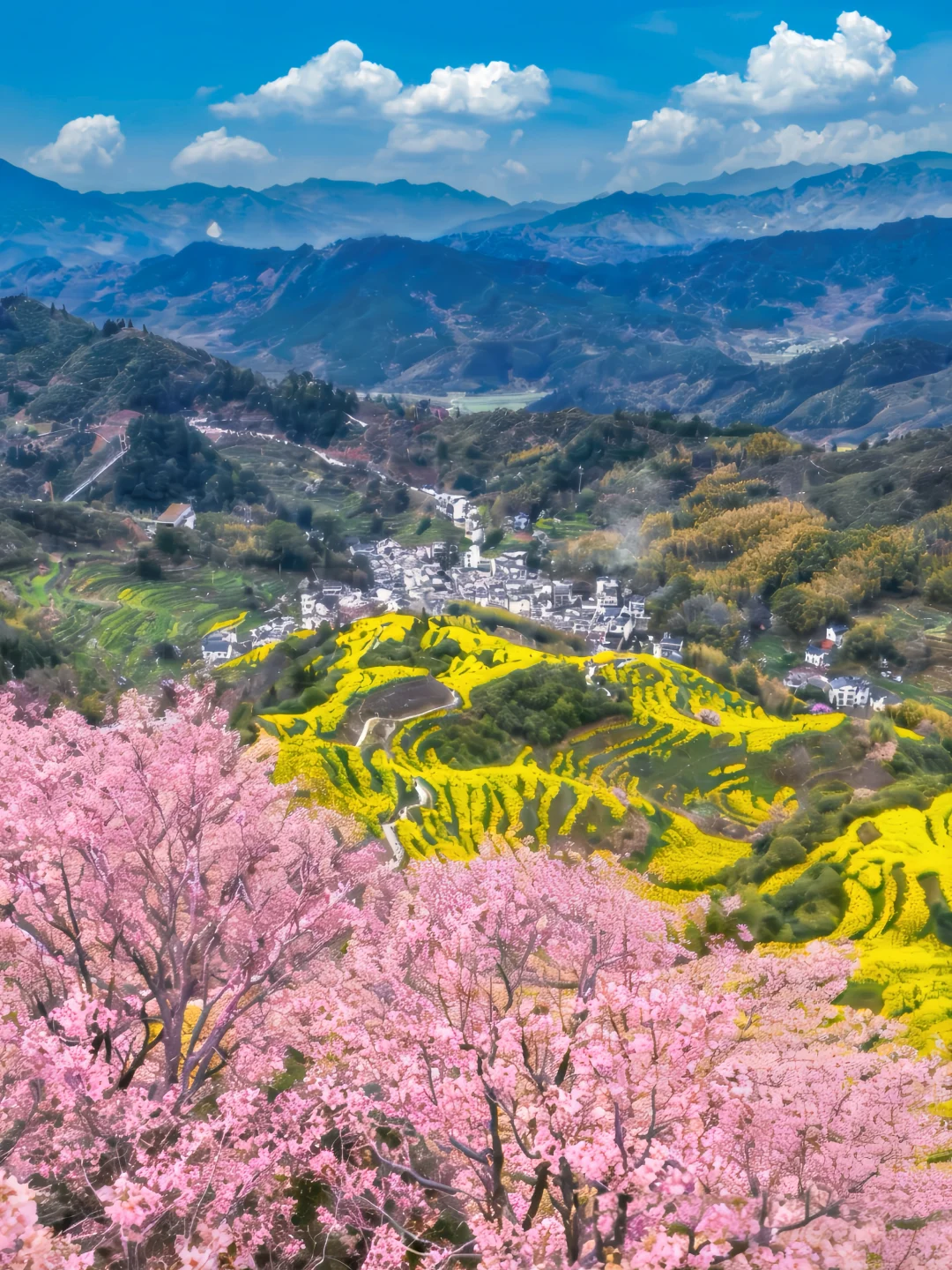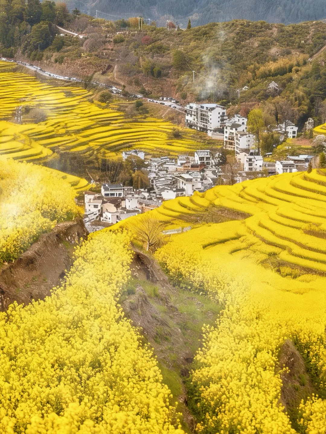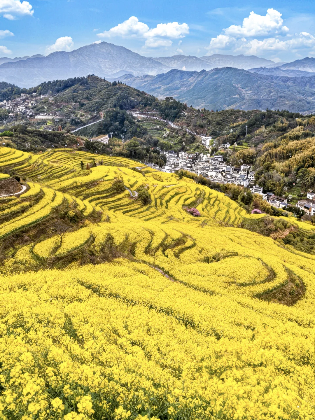 这里油菜花开的正盛,是打卡油菜花的不错选择,从山上俯瞰古村落和油菜花同框,美的像山水画一样