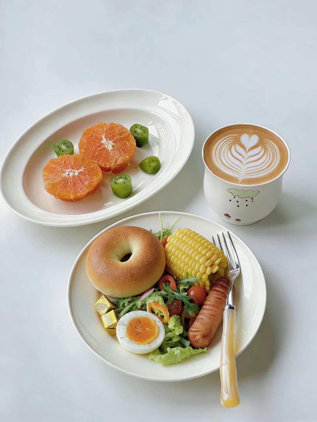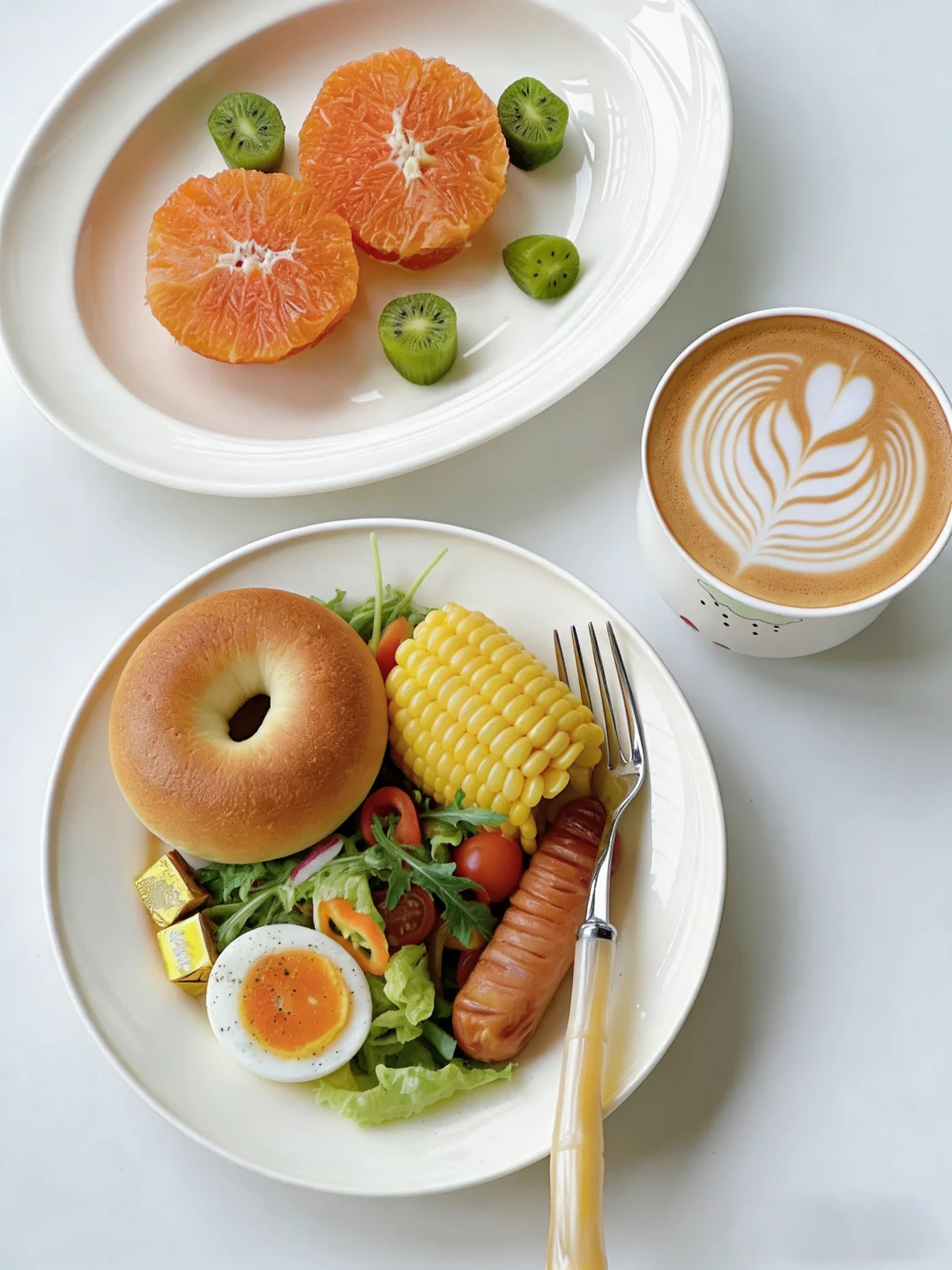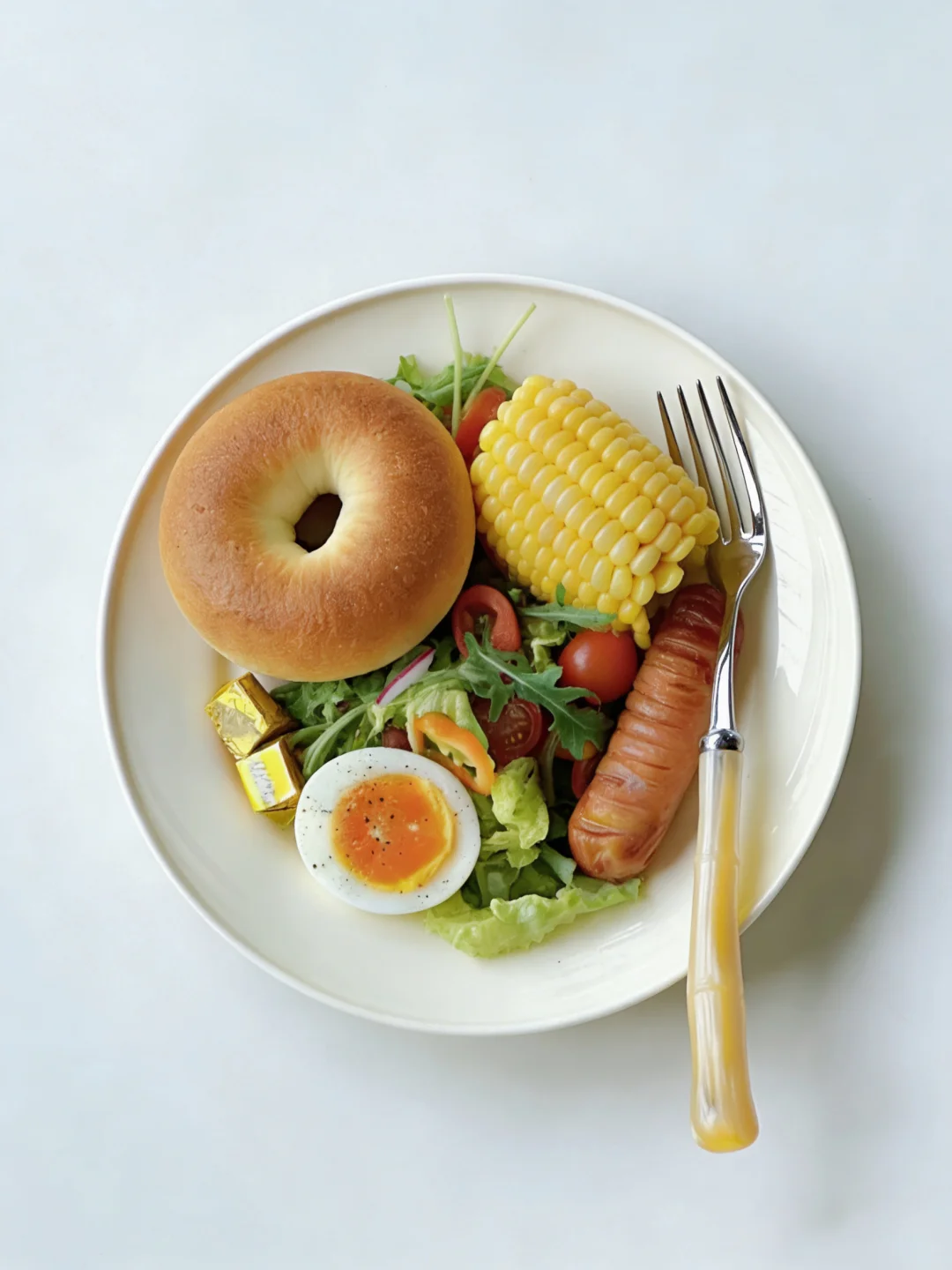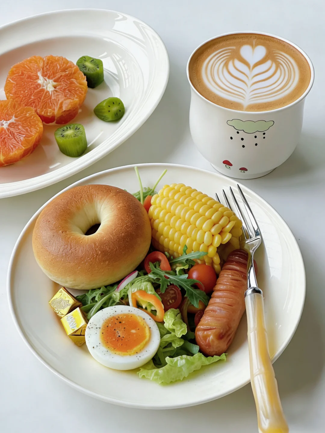 随心即是满分❤️ 新月安好顺遂! 今日早餐:贝果 🥯| 鸡蛋🥚玉米 🌽| 沙拉🥗 | 烤肠 | 热拿铁
