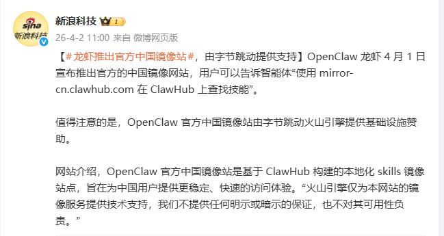 据了解,近期OpenClaw和字节跳动旗下的火山引擎合作,推出了官方中国镜像站。值得一提的是,尽管火山引擎方面为其基础设施提供了赞助,但其仍表示:“火山引擎仅为本网站的镜像服务提供技术支持,我们不提供任何明示或暗示的保证,也不对其可用性负责。”
