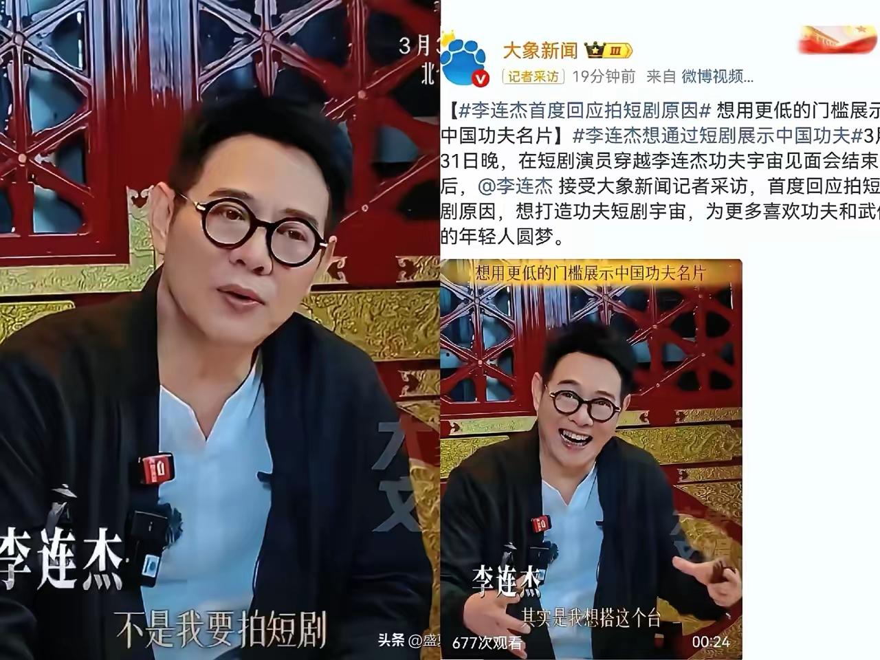 李连杰拍短剧,真不是为了赚钱!4月1号下午,李连杰突然冲上热搜,原因让人意外——他亲自澄清:“我拍短剧,真不是图钱。” 这个我觉得还是可信的,他钱已经足够多了,真没必要为了钱去拍短剧,毕竟目前短剧总体上虽然看着爽,但确实大都比较烂俗。确实是,现在很多的武侠类短剧,压根没点功底,乱搞一通,没看点。可李连杰偏偏要反着来:他说想搭个“功夫短剧宇宙”,给那些练了一身真功夫、却没机会上大银幕的年轻人一个出口。 也有人冷嘲热讽:“大陆这些演员满口仁义道德,把自己标榜成圣人。哪个工作不是为了赚钱养家,就非得整得那么奇葩。”但换个角度想,如果连李连杰这样的人都只盯着流量和快钱,那传统武术可能真的只剩特效和摆拍了。