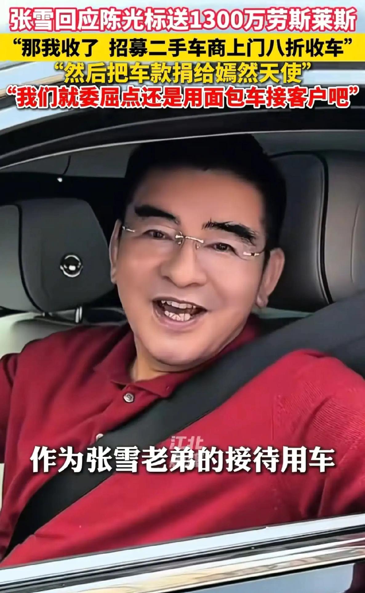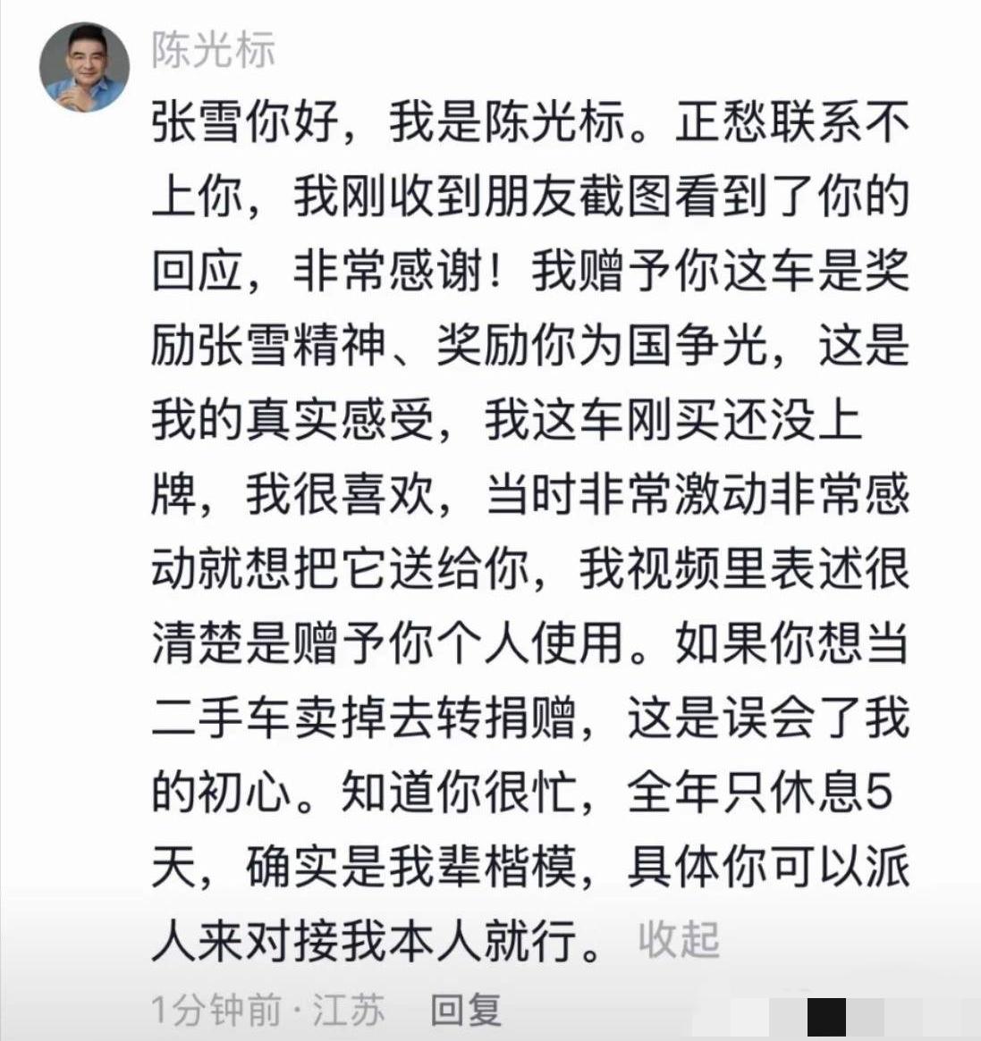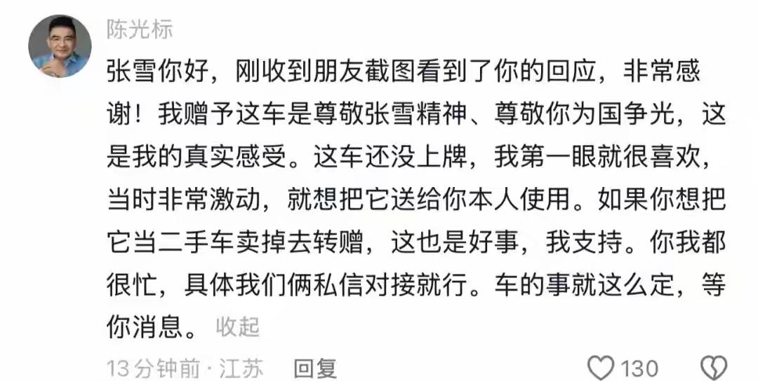 针对张雪关于把赠予的车卖掉的回复,陈光标连发两条动态: 第一条: 1、赠予你车子是因为你的精神打动了我,所以我才赠予你。 2、车子我自己很喜欢,车子还没上牌,我自己也很舍不得。 3、没有你的联系方式,只能通过媒体来联系你,车子是赠予个人使用,如果你卖了,那就辜负了我一番好意,你来人与我对接就行。 第二条是在删除第一条动态后不到一小时后发的,前面的基本没动,只是还关于赠车后的使用做了更改:如果你把它当做二手车卖掉去转赠,这也是好事,我支持。 两条动态,前后两个态度,不知道是陈光标怎么想的。刚开始他是不同意张雪把车卖掉的,不知道看了舆论还是怎么样,又同意把车卖了转赠,但是具体转赠于谁,他没有提。 可能,陈光标也没有想到,本以为是礼貌上的客气客气,谁能想到张雪直接回应收下车,并转赠于嫣然天使基金。 说起嫣然天使基金,让人忽然想起 原来张雪说的话是有内涵的。 当初嫣然医院欠租金的事情全网发酵,网友纷纷伸出援助之手,甚至有的企业表示免费提供医院场地,当然大善人陈光标也蹭了一波。 当时他谈的条件是让天后王菲唱歌,然后他才捐款。人家两位早已离婚,非得把公益扯上个人关系,妥妥的套路。 要捐就捐,要赠就赠,少些套路,多些真诚。不知道这次标哥被反套路,是否会肉疼。