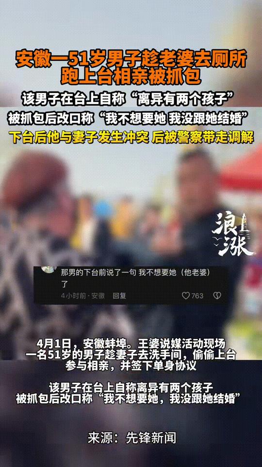 一名51岁男子趁老婆上卫生间偷偷上台参与相亲,并且签下单身协议,在台上自称离异有2个孩子,被抓包后竟然改口称“我不想要她,我没跟她结婚”。 当着那么多人说老婆,老婆当然不愿意,下台后两人便发生冲突,后来被警察带走调解。 真是林子大了,什么鸟儿都有,自己有老婆还上台相亲,而且脸不红心不跳,谎话连篇还狡辩,这样没脸没皮的人,警察就得好好教训教训他。 你们夫妻之间可能有矛盾,有怨气,但不能这样公开丢人现眼,这样做对台上的相亲对象不尊重,对老婆更不尊重,甚至是侮辱。 希望夫妻俩只是临时有点矛盾,毕竟相濡以沫快半辈子了,以后还是好好过日子吧! 对于此事,大家怎么看? 来源:浪涨新闻 安徽蚌埠