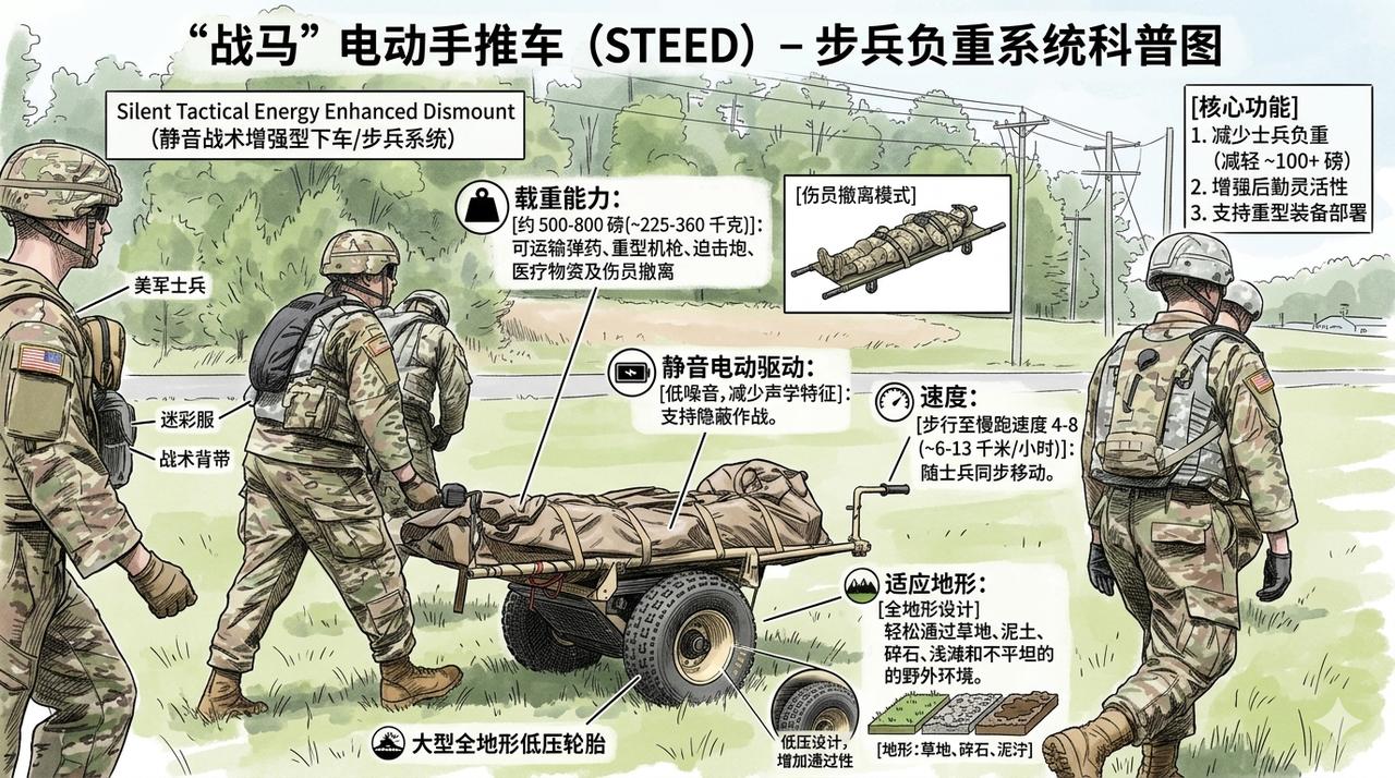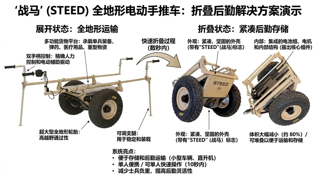 美国电动手推车,绰号“战马”,专业叫法“力量增强型静音战术手推车”,简称SEED。 它不仅采用了传统的双轮结构,同时配备了电动辅助功能和电池模块。 这是一种全地形电动载荷机动平台,由单人手动引导操作,旨在解决步兵“最后一公里”运输难题,尤其适用于复杂地形下的重物搬运、伤员后送和小分队持续作战。 使用STEED手推车的情况下,步兵小组的任务时间缩短最高64%,士兵体力消耗减少60%,同时有效负载增加了400%。 载重能力:最高约226.8 公斤。 续航里程:单电池组在困难地形下可达24-48 km。 电机:1500W电动电机,无排放、战术静音、完全可潜水(IP67级别)。 电池:24V系统(2个12V电池),采用LiFePO4锂离子电池,充电时间2-4小时; 速度:最高约10.4 km/h,支持前进/倒退及零转弯半径。 地形适应性:可穿越岩石、湿地、楼梯、隧道、城市废墟,甚至完全潜水; 可运输重武器、弹药、食物、水、无人机/无人车、破障设备或伤员;同时作为移动电源,支持72小时以上小分队电力需求。 通过实际测试,小推车可减少士兵约60%卡路里消耗和心血管压力,降低非战斗伤亡风险;任务时间缩短35-64%,士兵到任务比例降低80%,态势感知显著提升。 这辆小推车别看不起眼,单价却要17万美元(约合120万元人民币)。据称整个项目历时1年,研发费用高达8亿美元 天价“战马”手推车,设计成可折叠,使用起来非常方便,和我国婴儿推车的设计非常相似。其厚实的16寸的轮胎,是这款车最大的组件,和美国福特猛禽F150皮卡车出厂搭配的AT越野轮胎几乎一样。就小推车这个价格,在美国都可以买一辆奔驰大G了。 不过,你不拿我不拿,史密斯专员怎么拿。