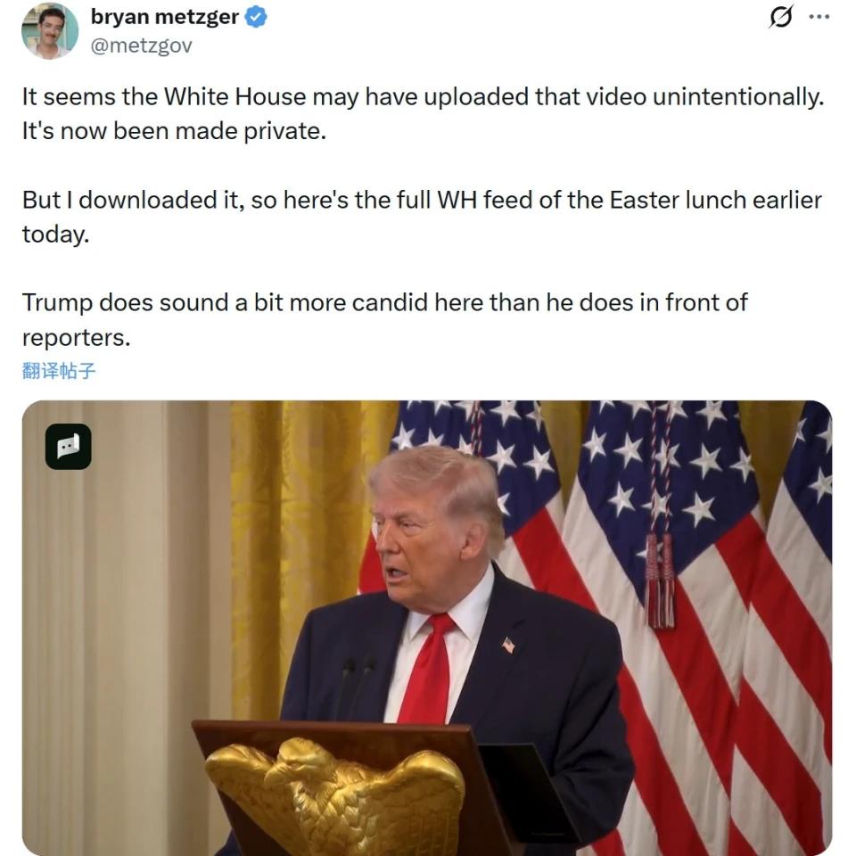 真的要被特朗普笑不活了! 私下闭门吹的牛,居然被白宫自己人给“卖”了,全程视频曝光,每一句都离谱到没边! 核心一句话直接震碎三观:“要是没有我,换任何一个总统在这个位置上,以色列早就凉透了!” 就在当地时间周三,白宫办复活节午餐会,特朗普搞了场闭门演讲,本来全程不对外公开,结果闹了个史诗级乌龙。 白宫官方的YouTube账号,居然手滑把完整的现场视频直接传上网了!等工作人员反应过来,赶紧把视频设成私密,早就晚了——《商业内幕》的记者已经把视频下载存档,转头就全给曝光到网上了。 也正是这段没经过修饰的视频,让大家看到了特朗普比公开采访时更“坦率”的真面目,槽点多到数不过来。 首先就是把甩锅文学玩明白了,对象还是副总统万斯。 他当着全场人的面说,万斯正在全力推进和伊朗的谈判,干得很不错。 结果下一句直接露底:“要是这协议最后谈不成,我就全怪万斯;谈成了,那功劳全是我的。” 一句话给台下人都逗笑了,他还不忘补刀,调侃万斯最近瘦了,“我本来想找个体型壮的绅士,结果现在找了个完美的理想人选”。 对伊朗,他更是放了没边的狠话。 根据路透社知情人士的消息,特朗普已经让万斯通过巴基斯坦中间人,给伊朗递了最后通牒:要么坐下来谈成停战协议,要么美国就直接动手,打击伊朗的关键基础设施。 闭门会上他说得更直白,说美国可以非常轻松地夺走伊朗的石油,自己本来就倾向于直接把石油拿走,还说要再对伊朗来几次打击,“接下来两到三周,我们要把他们打回石器时代——那才是他们该待的地方”。 就连北约盟友,他也张口就怼,说“北约里全是靠不住的伙伴”,还特意点名法国总统马克龙,骂他不肯为冲突派军舰支援。 更离谱的是,他还拿马克龙的私生活传闻开涮,暗指去年马克龙被拍到在专机上被妻子布丽吉特“打脸”的事,调侃“他老婆对他可够差的……他下巴被老婆打得还疼着呢!” 最狂的还得是他的自夸,完全不带藏的。 他当着全场宾客的面,直接提前剧透了当晚要发的全国电视讲话,说自己当晚9点要发表演讲,核心内容就是“告诉所有人我有多伟大,我干得有多出色,多么了不起、多么无可挑剔”。 而当晚的全国讲话里,他也果然说到做到,一上来就宣称自己对伊朗的战事取得了“快速、决定性、压倒性胜利”,还说这场战争很快就要结束了。 咱就是说,特朗普这波操作,真的是把“功劳全揽,黑锅全甩”玩到了极致。 你觉得他这波口无遮拦的发言,会影响美伊之间的谈判吗?评论区聊聊你的看法。