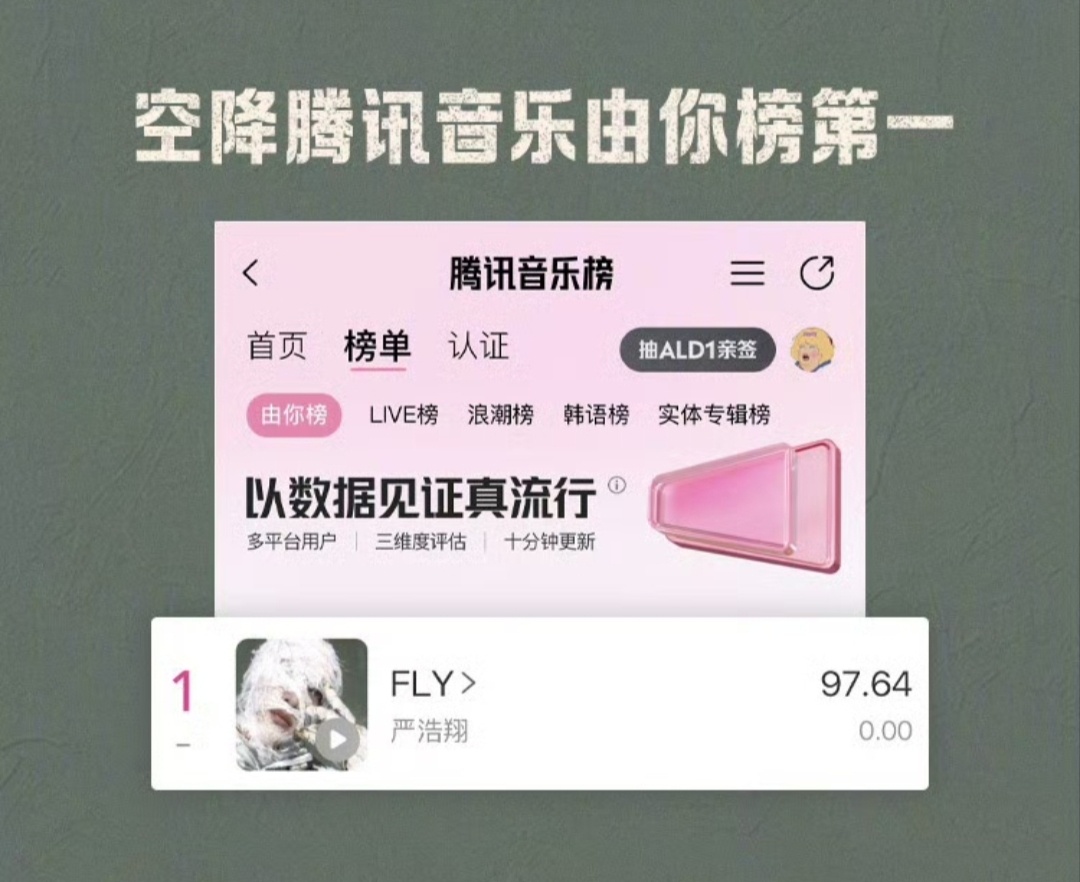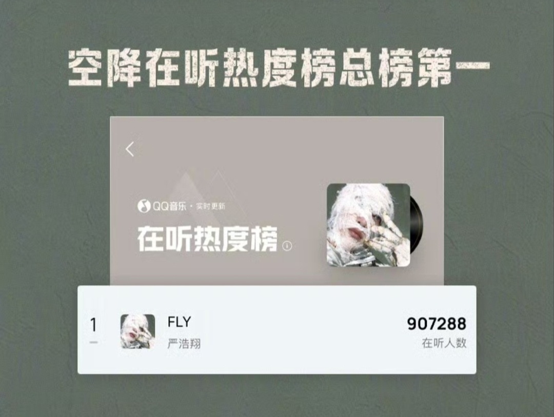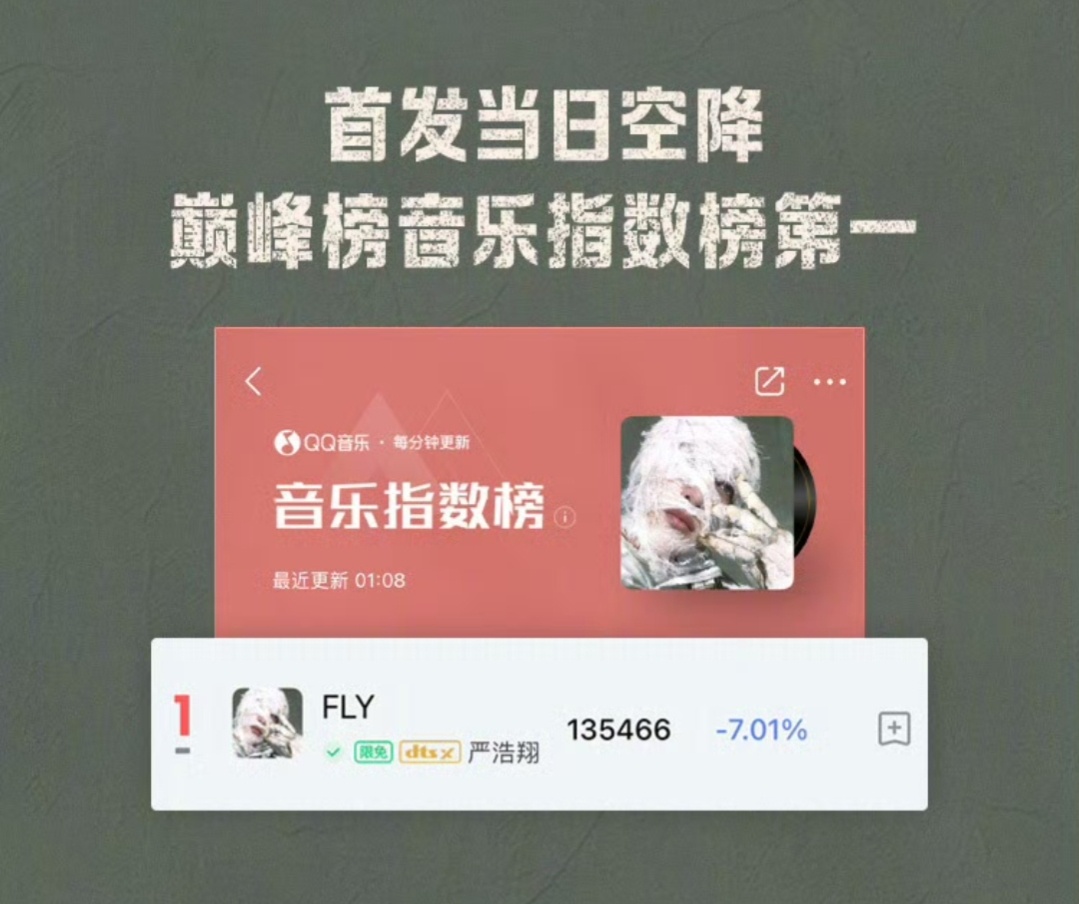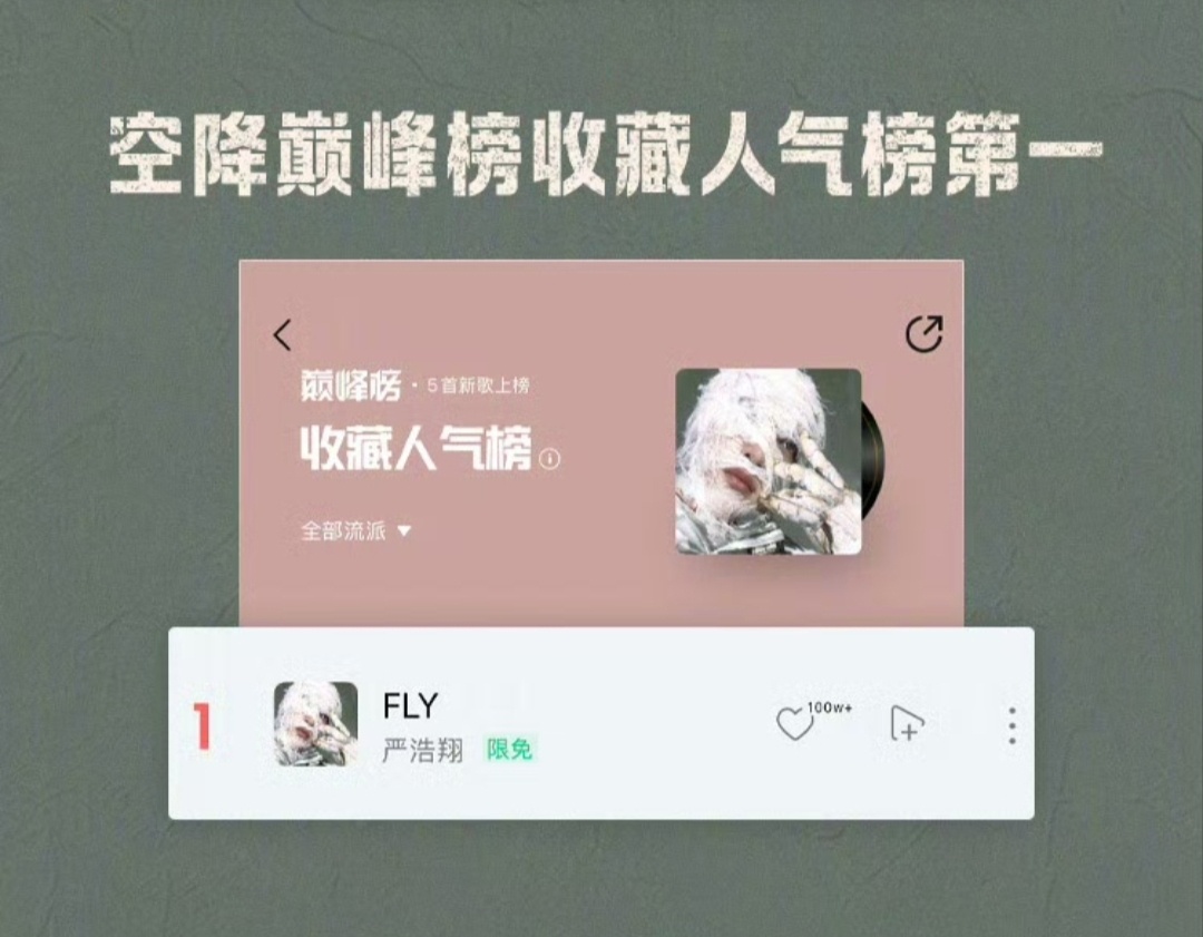 严浩翔FLY新歌战报严浩翔全新EP SMⅡ 概念曲《FLY》战报🔥上线17秒评论破999+!上线6分26秒 评论破500000+!11分1秒 评论破1000000+!空降巅峰榜新歌榜实时榜及日榜+飙升榜+流行指数榜+收藏人气榜+腾讯音乐由你榜+在听热度榜总榜第一!首发当日空降巅峰榜巅峰潮流榜+音乐指数榜+评论人气榜第一!严浩翔FLY九榜第一