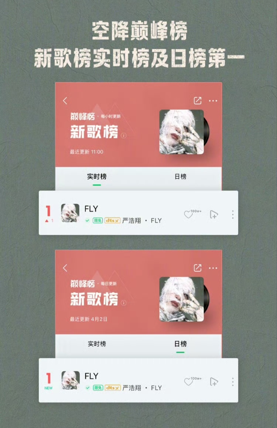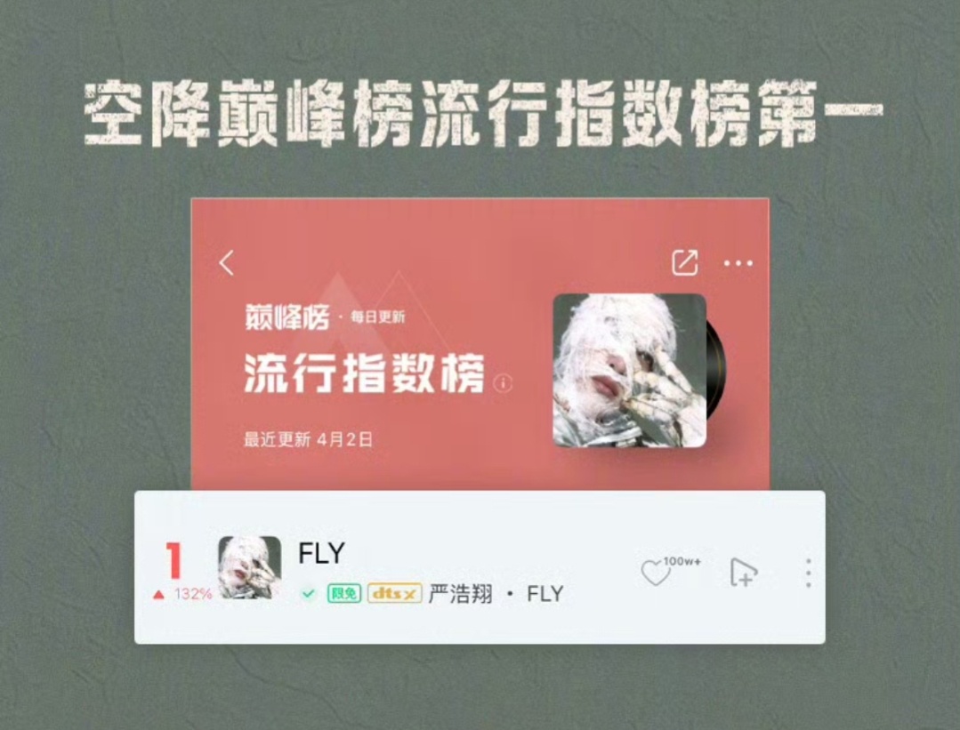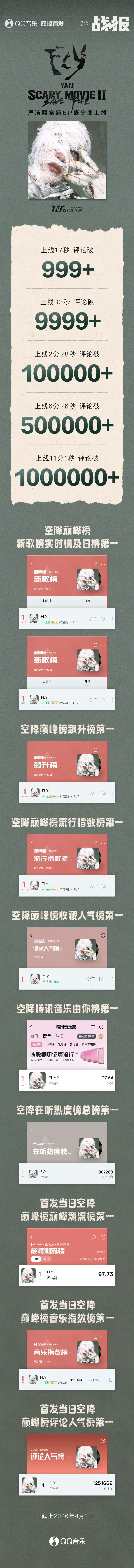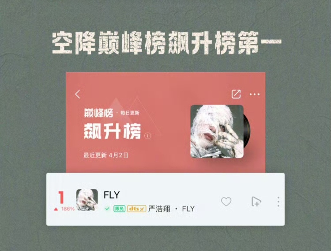 严浩翔FLY新歌战报严浩翔全新EP SMⅡ 概念曲《FLY》战报🔥上线17秒评论破999+!上线6分26秒 评论破500000+!11分1秒 评论破1000000+!空降巅峰榜新歌榜实时榜及日榜+飙升榜+流行指数榜+收藏人气榜+腾讯音乐由你榜+在听热度榜总榜第一!首发当日空降巅峰榜巅峰潮流榜+音乐指数榜+评论人气榜第一!严浩翔FLY九榜第一