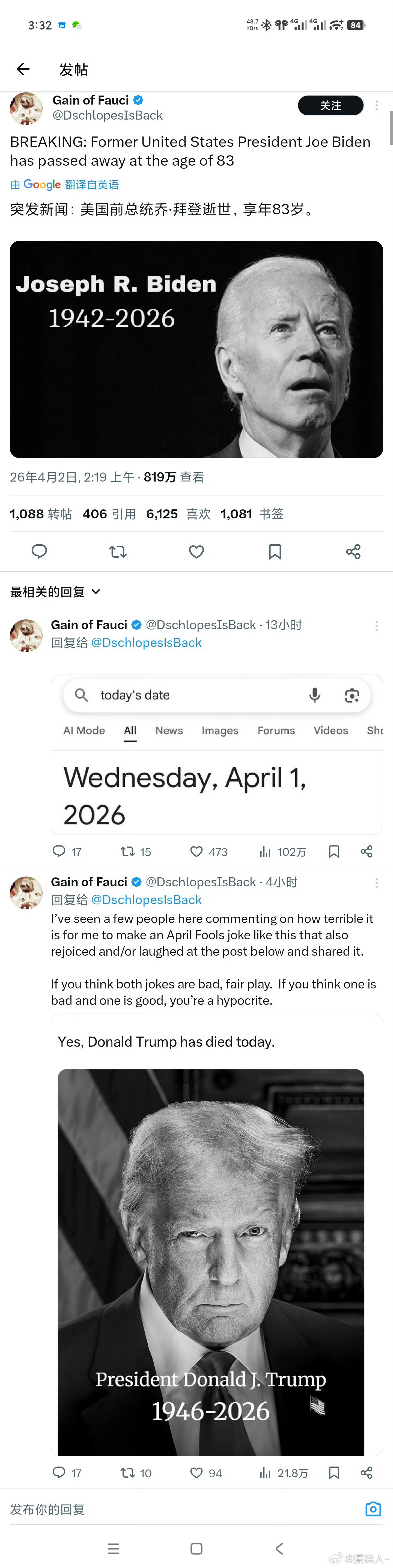 拜登真的假的,看了一下推文都800多万,今天可是美国愚人节