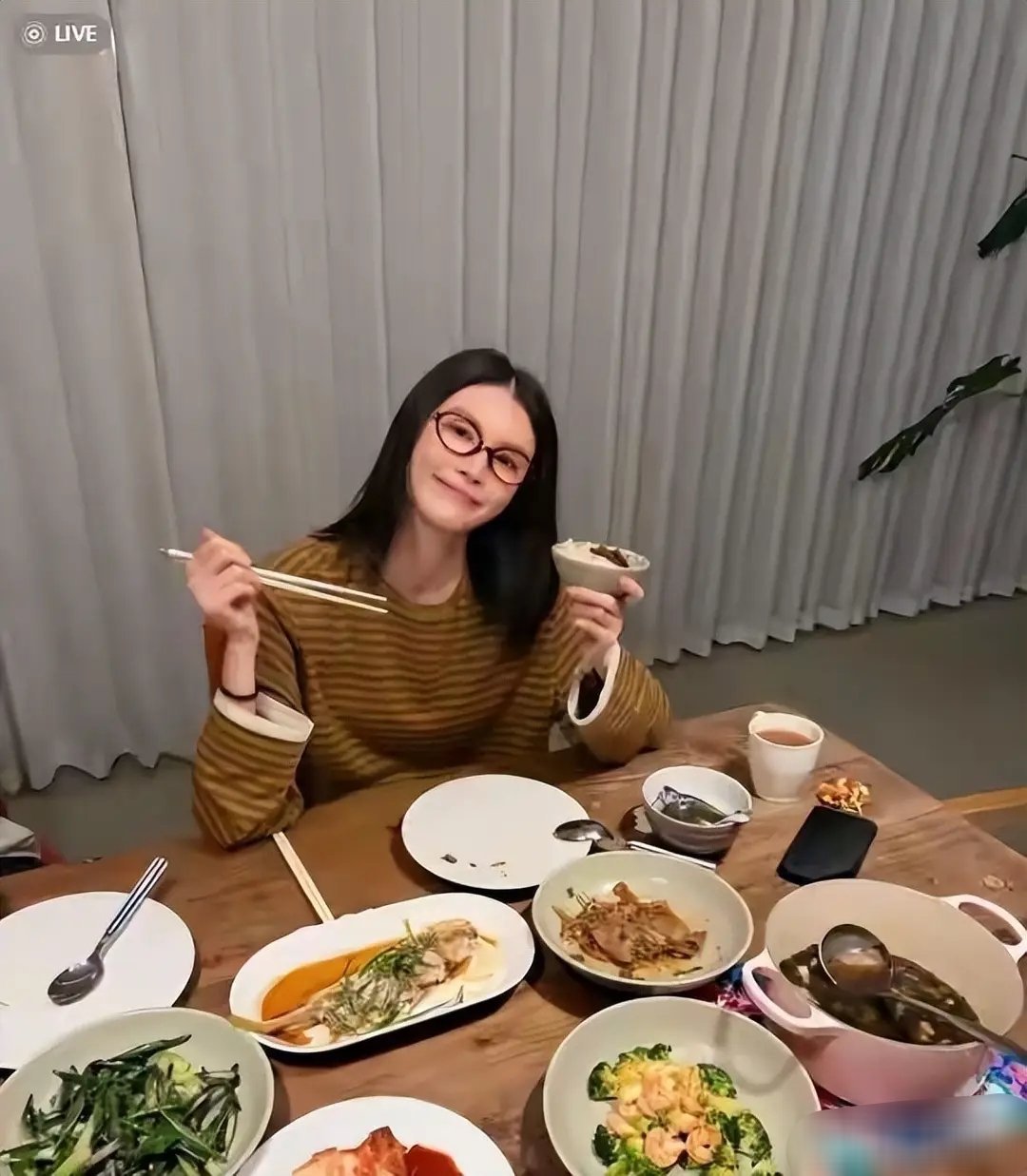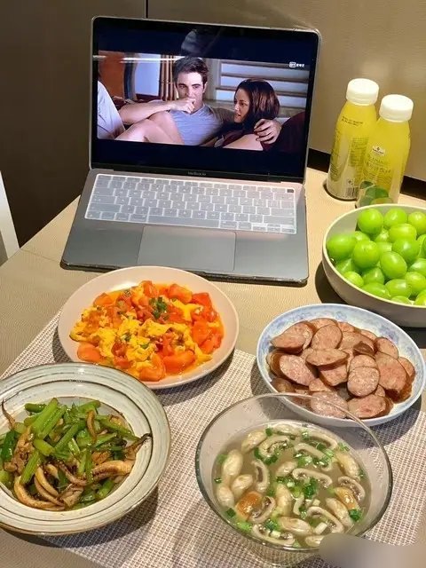 何穗晒老公做的五菜一汤,还有鲜花点缀,真是甜蜜恩爱!