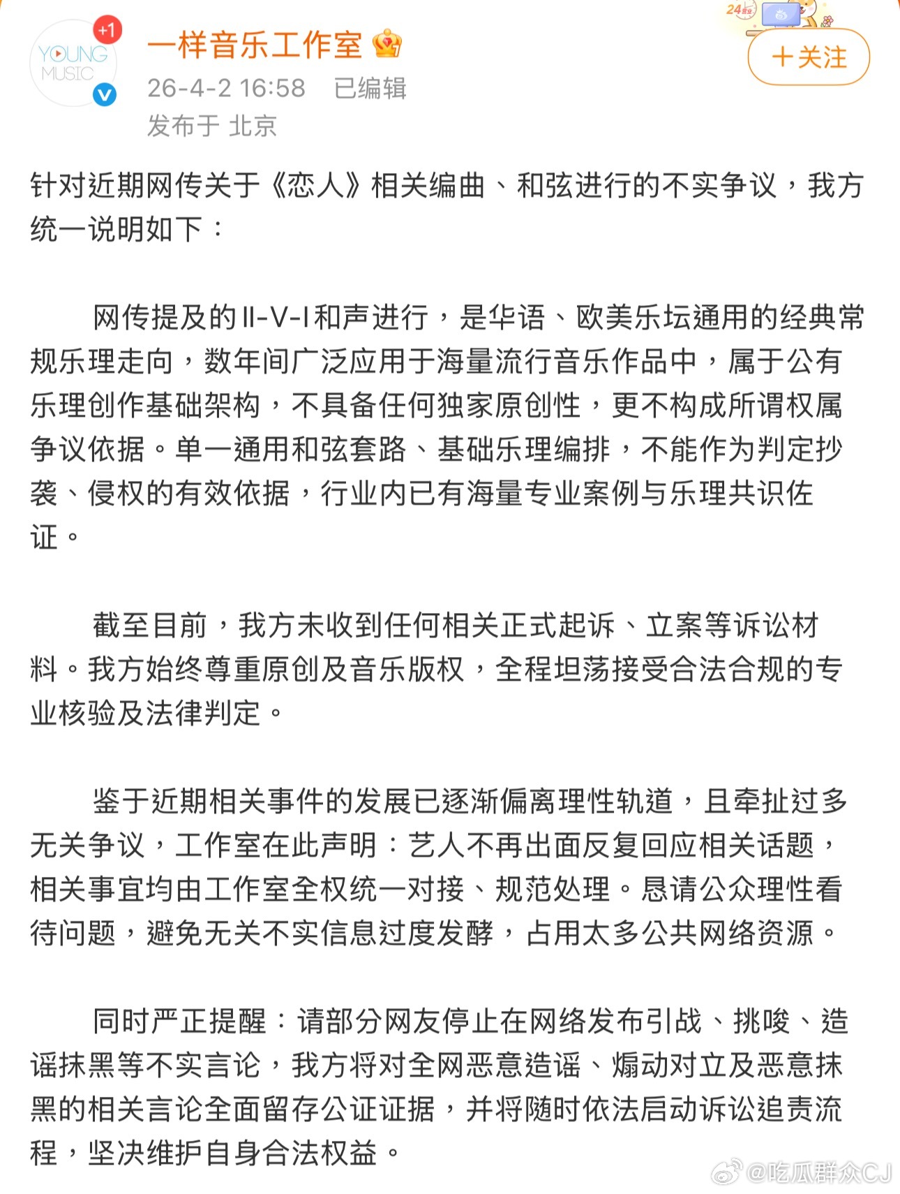 李荣浩方否认恋人抄袭李荣浩工作室就近期《恋人》编曲及和弦问题做出回应: