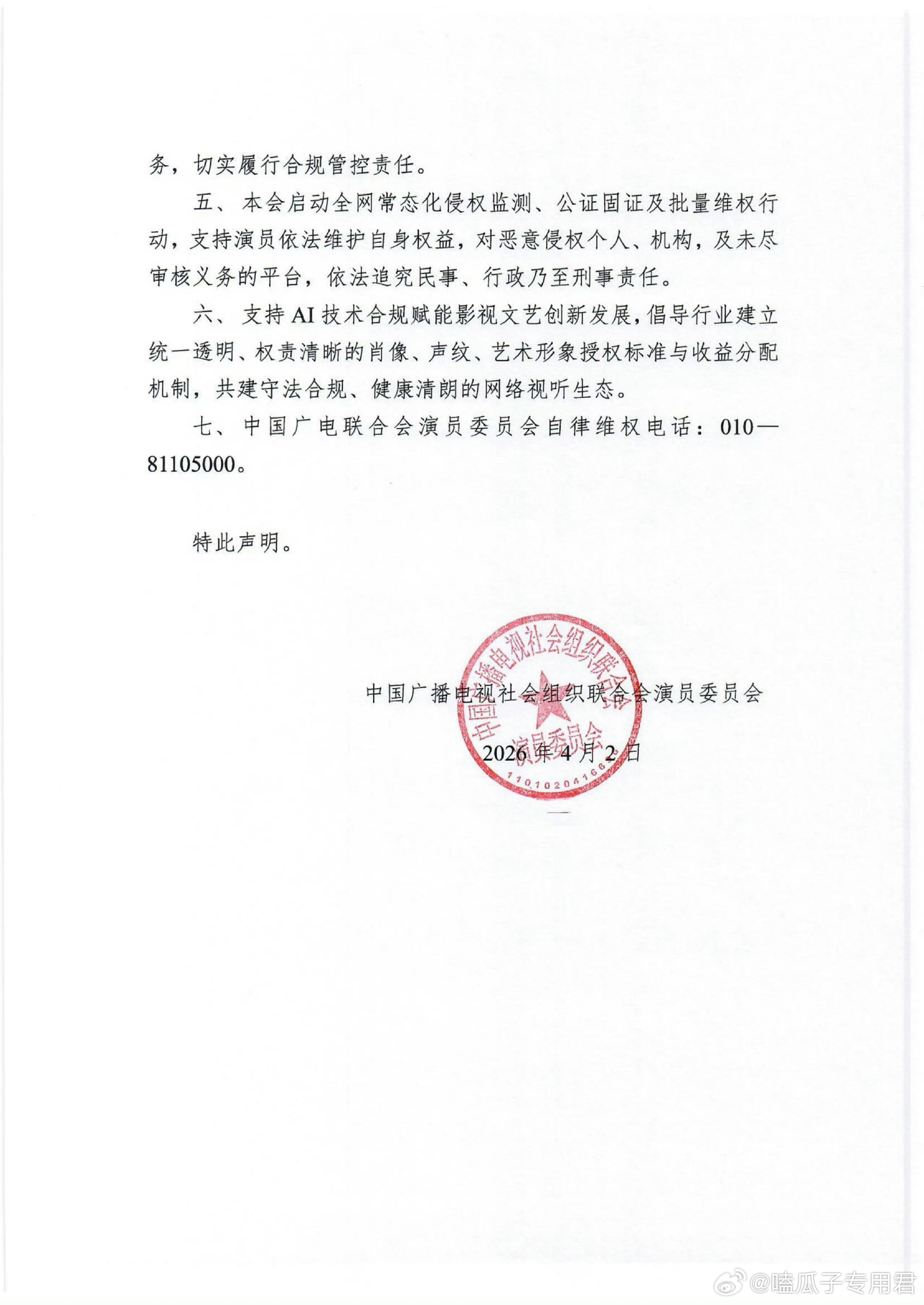 中国广播电视社会组织联合会演员委员会于今日发布严正声明,针对当前频发的AI换脸、声纹克隆、擅自抓取演员影像音频用于AI模型训练等侵权行为,明确维护演艺人员合法权益。