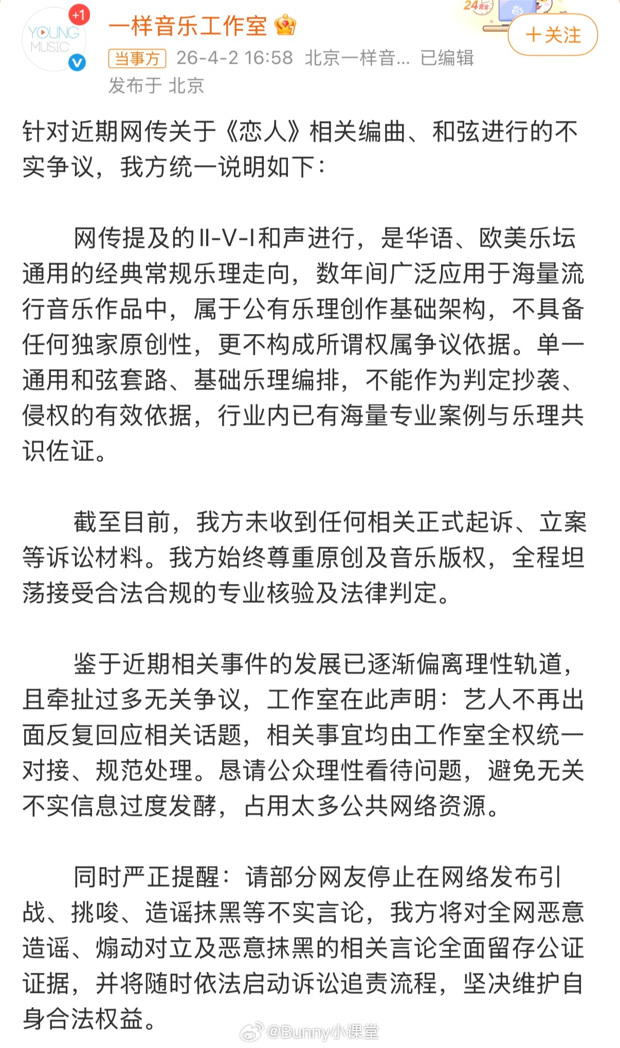 李荣浩工作室回应恋人抄袭争议,称截至目前,未收到任何相关正式起诉、立案等诉讼材料。始终尊重原创及音乐版权,全程坦荡接受合法合规的专业核验及法律判定。李荣浩本人也不会再出面反复回应相关话题