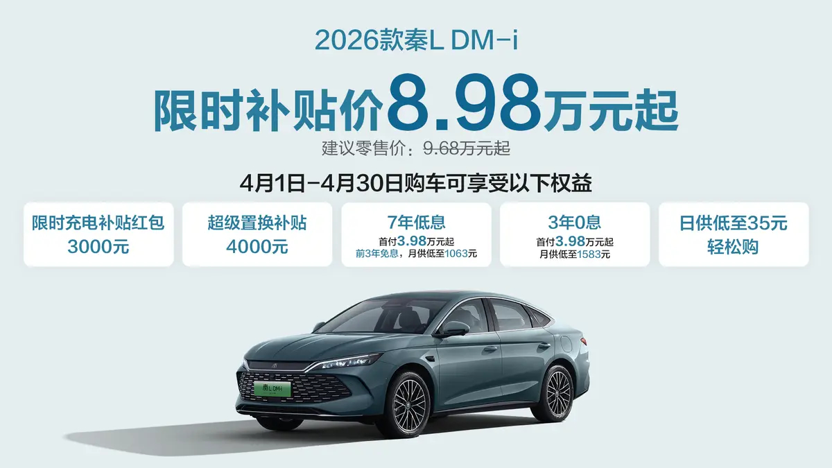 -秦L DM-i,限时补贴价8.98万起(指导价减7000元),3000元充电补贴+4000元置换补贴,首付3.98万起,同样是3年0息、7年低息,日供35元,210km纯电续航、云辇-C底盘、L2级智驾