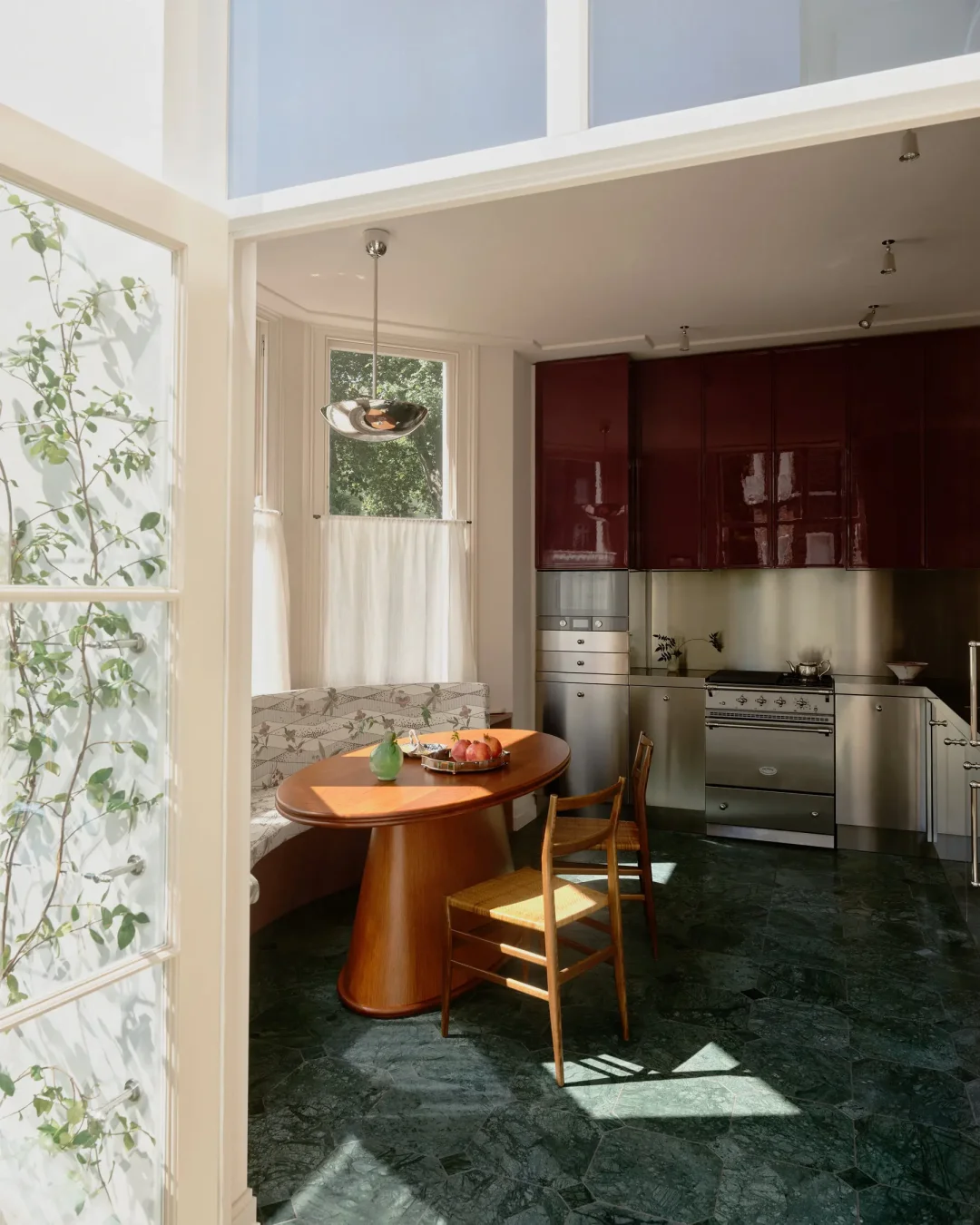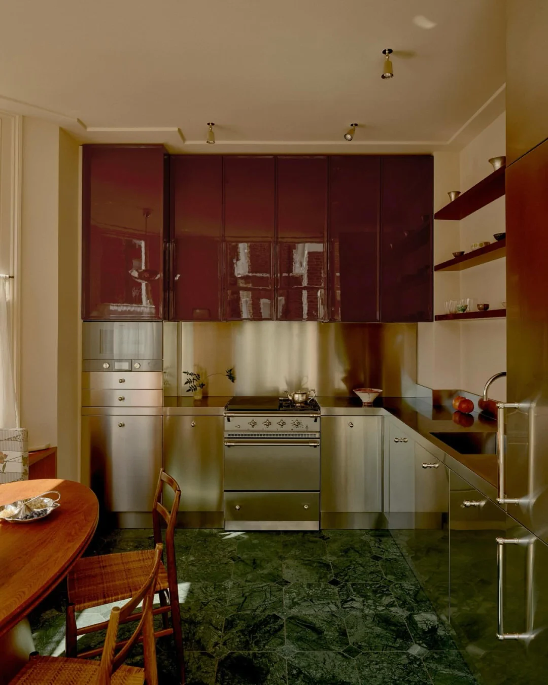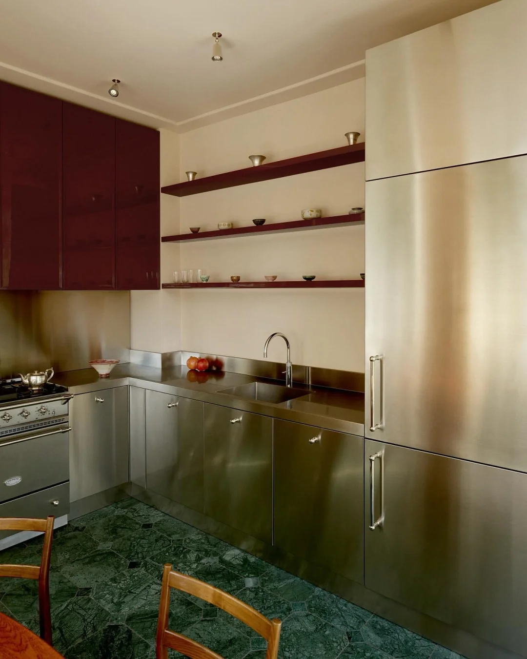 London的天气,需要些温暖靓色 红色烤漆柜子、绿色大理石地面 、不锈钢柜子 亮面的光泽也很好看 via:Studio Valerie Name