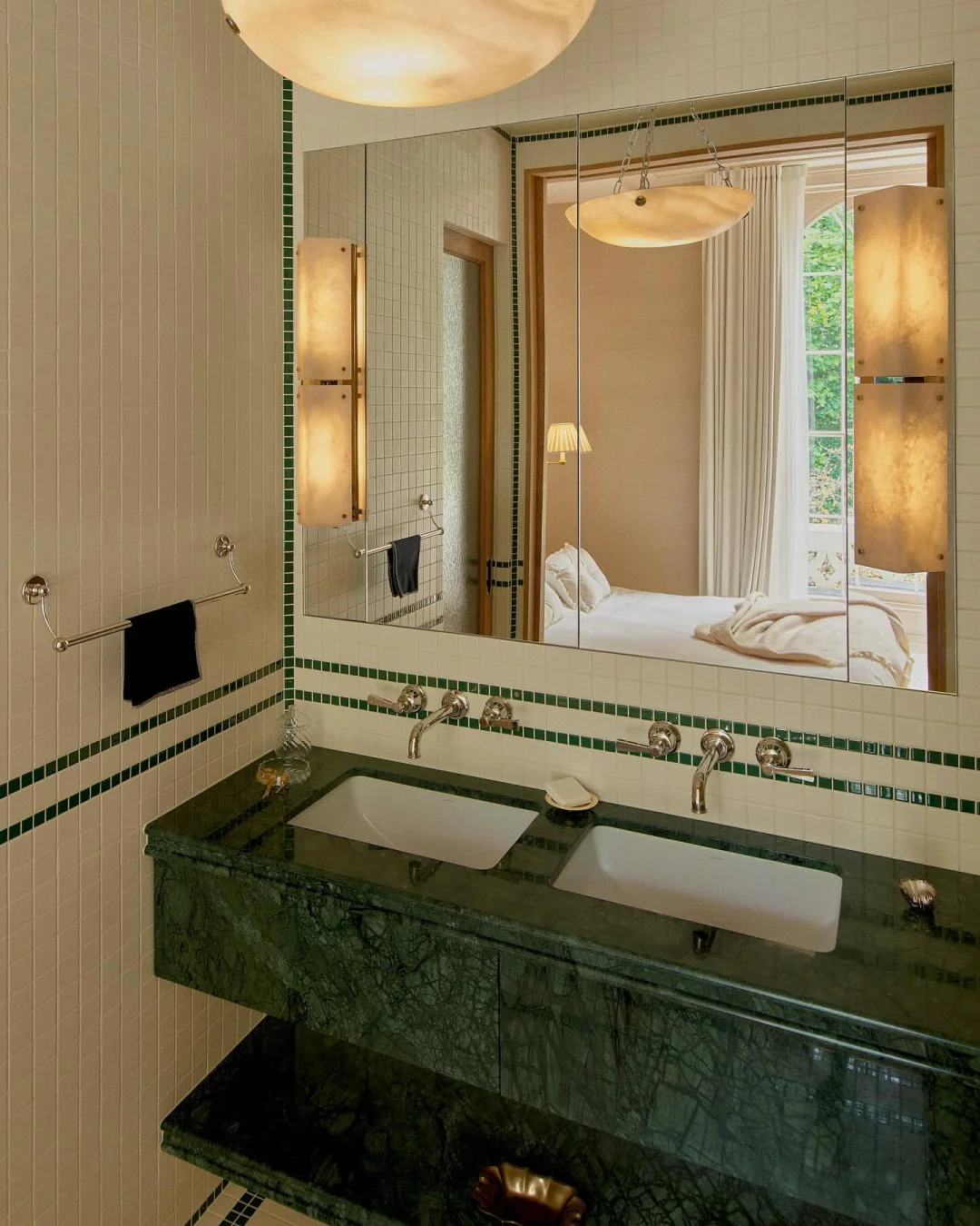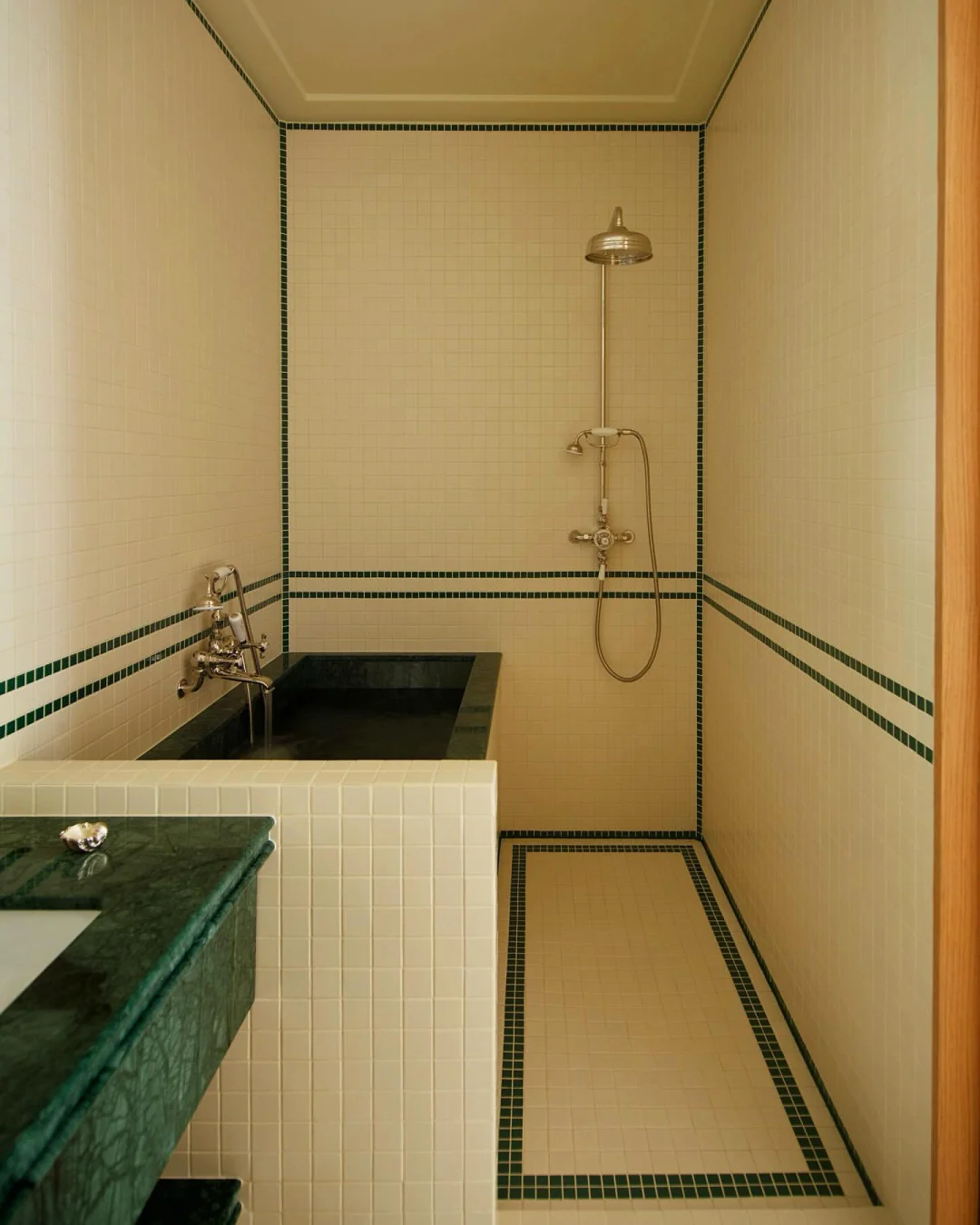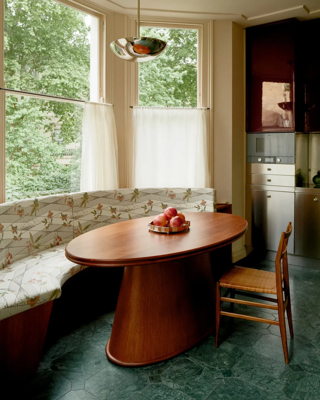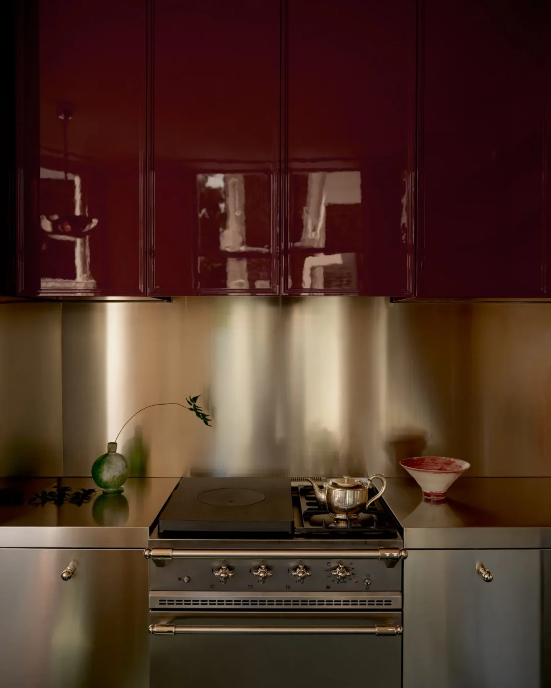 London的天气,需要些温暖靓色 红色烤漆柜子、绿色大理石地面 、不锈钢柜子 亮面的光泽也很好看 via:Studio Valerie Name