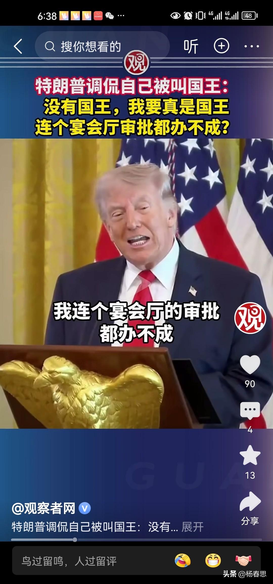 特朗普真的是又好气又好笑啊,特朗普说,他们称我为国王,没有国王。如果我是国王,连个业务厅都批不了。特朗普想想重修白宫宴会厅,被国会驳回了,特朗普气的要死。到手的工程又泡汤了[捂脸][笑哭][呲牙]有一说一,特朗普的性格确实挺幽默的[笑哭]