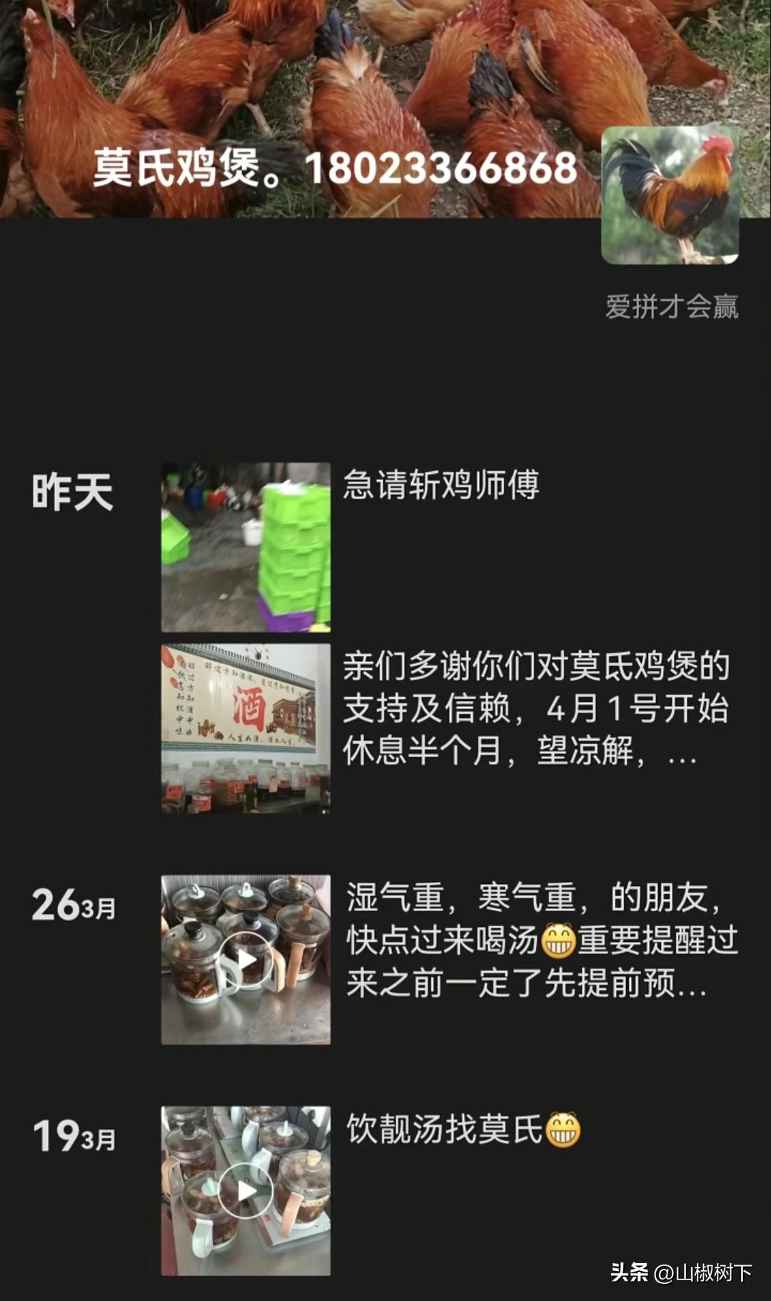 你说好吃我未必会去,但你说能祛湿那我高低要尝个咸淡,最近佛山莫氏鸡煲大火,以前老板一天只做10桌左右,现在这两天都已经飙到100桌了,莫老板说做的腰都痛了,剁鸡剁到生无可恋,甚至在朋友圈发了招工启示,急招斩鸡师傅。 不仅如此,这位不想红的老板还开了小号,连发三条视频黑自己家店说不好吃,果然人狠到一定地步连名声也不要了,被网友识破后还问网友《你们怎么知道我是谁》,哈哈,不得不说老板多少是有点幽默在身上的。 原本的半个月休假终究还是泡汤了,做完一拨又一拨,果然人一染上班味就很难再笑出来了,老板:早知道就不接刘雨鑫那一单了[笑哭][笑哭]