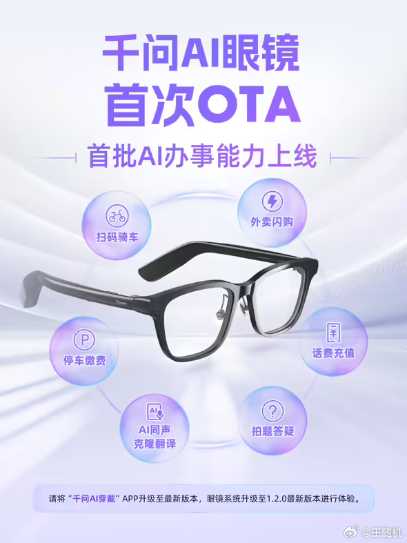 千问 AI 眼镜首次 OTA 推送,将深度接入支付宝及淘宝闪购,支持话费充值、停车缴费等