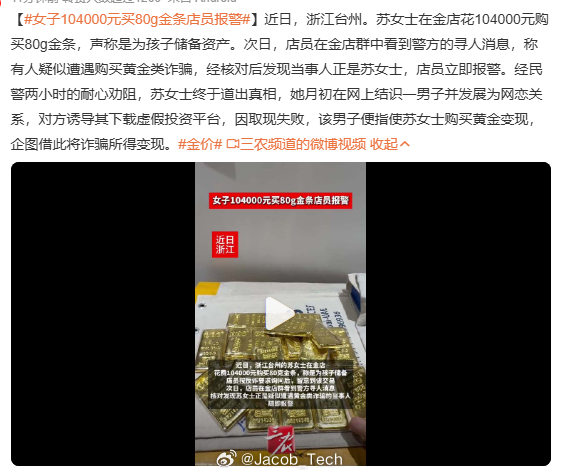 女子104000元买80g金条店员报警woc!这直接把女子的积蓄给掏空了吧,好