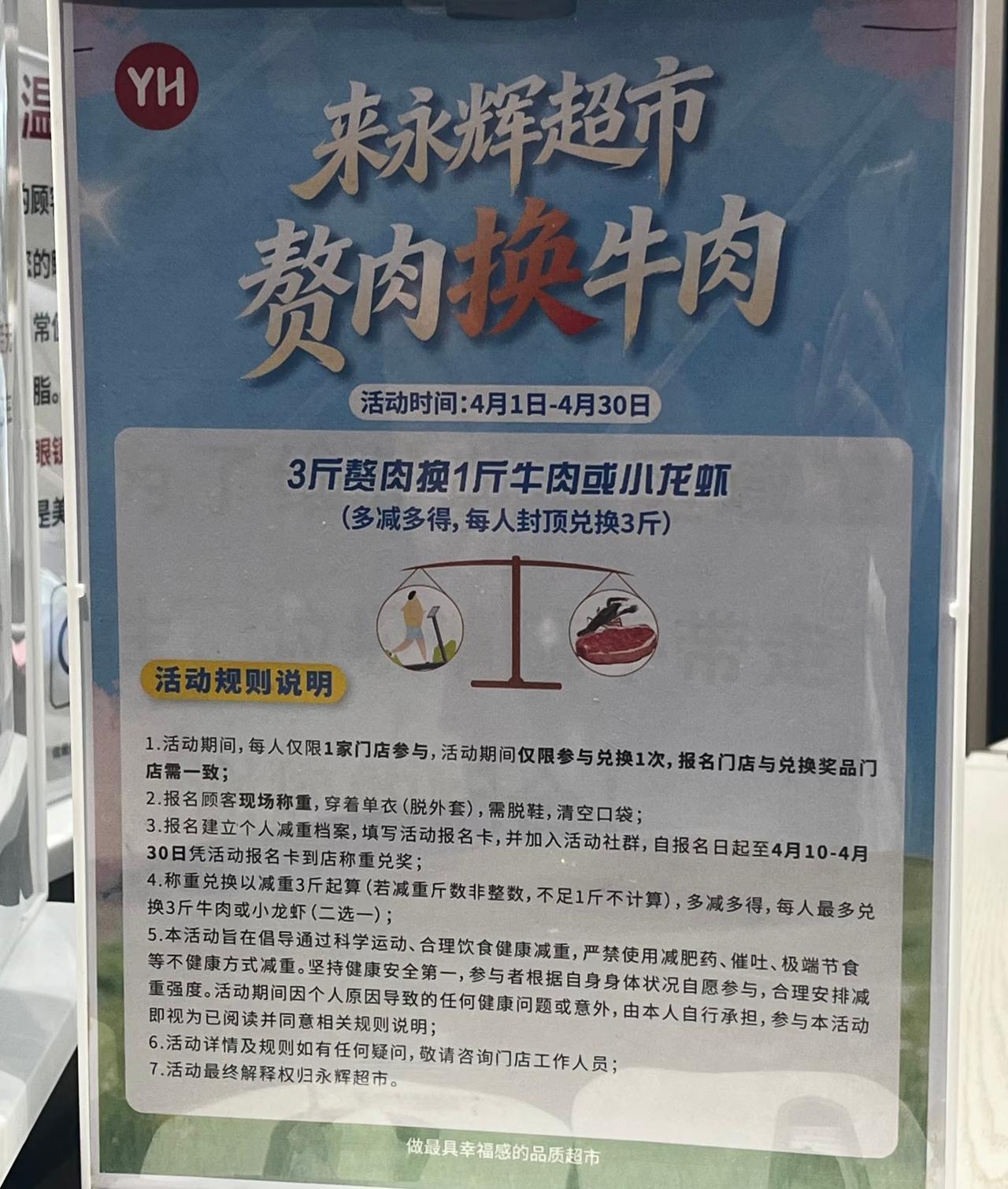 你们来永辉换牛肉了吗? 最近永辉超市“赘肉换牛肉”活动挺火, 这不下了班就来报名了。 并没有网上说的要买满88的东西 才能有报名资格。 也没有说的前100个名额, 这两种我都问过了统统没有哦! 来以后只需要到服务台, 然后脱衣服和鞋称重即可。 随后就是排队登记信息, 然后工作人员会让你加个活动群, 给你讲解怎么使用, 最后给一张活动报名卡! 等到月底减肥达标了, 过来领牛肉即可。 每减三斤赘肉可以兑换一斤牛肉, 最多没人可以领三斤。 说实话这个活动还是不错的, 趁着天气不错减减肥, 还能收到奖品, 何乐而不为呢是不? 超市 永辉超市 减脂换牛肉 超市活动 胖永辉超市