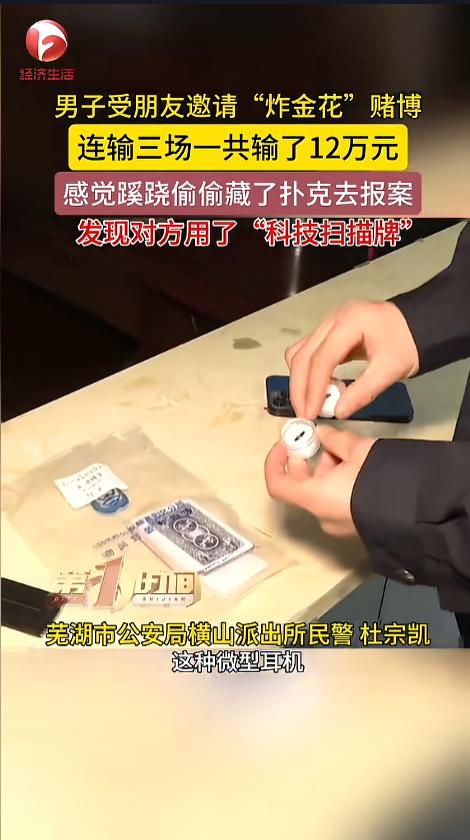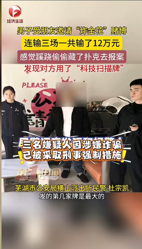 “自作孽不可活!”近日,安徽芜湖,一男子应朋友邀请,玩起了“炸金花”赌博,但是接连三场下来,自己输了十好几万。男子感觉不对,偷偷藏了一副牌,去派出所报了案。结果发现,自己竟是碰上了高科技!网友:十赌十输! 赌博一直是国内严令禁止的,它害的不少人妻离子散,家破人亡。可就是这样,还有人怀着一夜暴富的心思,参与其中,输惨了才知道后悔。 据媒体4月2日报道,当日,男子拿着一副扑克牌到派出所报案,他说,在朋友的邀请下,自己跟他们玩了炸金花。可一连三场,最后输的都是自己,连输了12万。他感觉很蹊跷,自己偷偷藏了一副扑克,来报了案。 这扑克里面暗藏玄机。虽然看起来和普通牌一模一样,但却可以被相机扫描。赌博时,他们把一部带有侧面摄像头的手机,放在桌上,自己耳朵里带上微型耳机,就能收到播报,知道每家的牌什么样,从而稳赚不赔。 经过调查,民警发现,和男子一起赌博的朋友,是一伙的,他们合伙给男子做了个局。很快,三人就被警方抓获,被采取刑事措施,男子也因涉嫌赌博被行政处罚。 网友看后表示,这技术都是十好几年前的了,现在新的手段更隐蔽,骗起人来更好用!赌博还想赢,简直是痴人说梦!老实的躲远点,才能不上当! 信息来源:《男子受邀去赌博,三场连输12万,报警后才得知被坑了。 男子受朋友的邀请去赌博,三场连输12万,觉得蹊跷去报警,才发现自己被设局。》AHTV第一时间