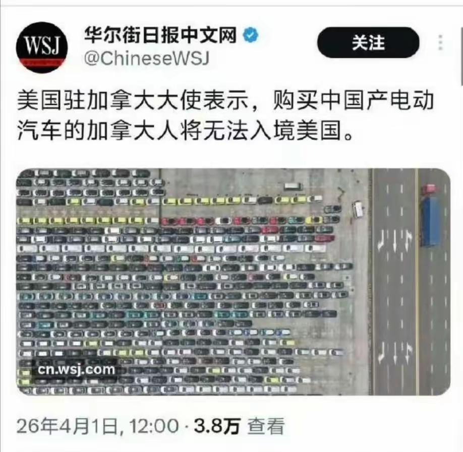 这是什么神操作? 媒体报道显示,美国驻加拿大大使表示,购买中国产电动汽车的加拿大人将无法入境美国。 这是真的吗?有点太离谱了吧!
