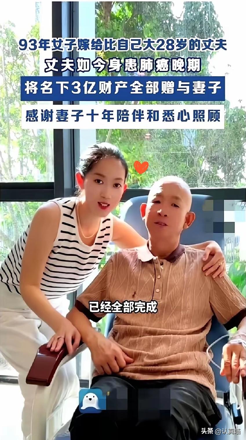 不知道大家有没有刷到, 海南一位61岁的肺癌晚期大哥, 做出了让所有人意外的决定。 他手握三亿多资产,却在清醒之际,把所有家产全部转给了33岁的妻子,前妻的孩子分毫未得,手续干脆利落,没有丝毫犹豫。 很多人只看到巨额财富的归属,却忽略了病床前四年的陪伴。这位小他28岁的妻子,不离不弃陪他抗癌,五次化疗全程照料,医院里日夜相守,端屎端尿从无怨言,结婚多年只谈情分,不提钱财。 在利益至上的年代,这样的选择更显珍贵。