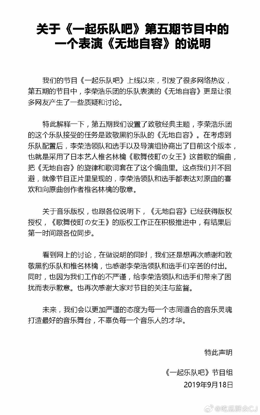 2019年9月,李荣浩在优酷综艺《一起乐队吧》所带领的乐队重新诠释黑豹乐队的《无地自容》时,套用了日本歌手椎名林檎名作《歌舞伎町的女王》的编曲。对此节目组回应,是李荣浩领队、选手和导演组协商出了套用编曲的决定,但截止声明发布时还没拿到相关版权(正在积极推进中),正片里也没有标注编曲来自椎名林檎。