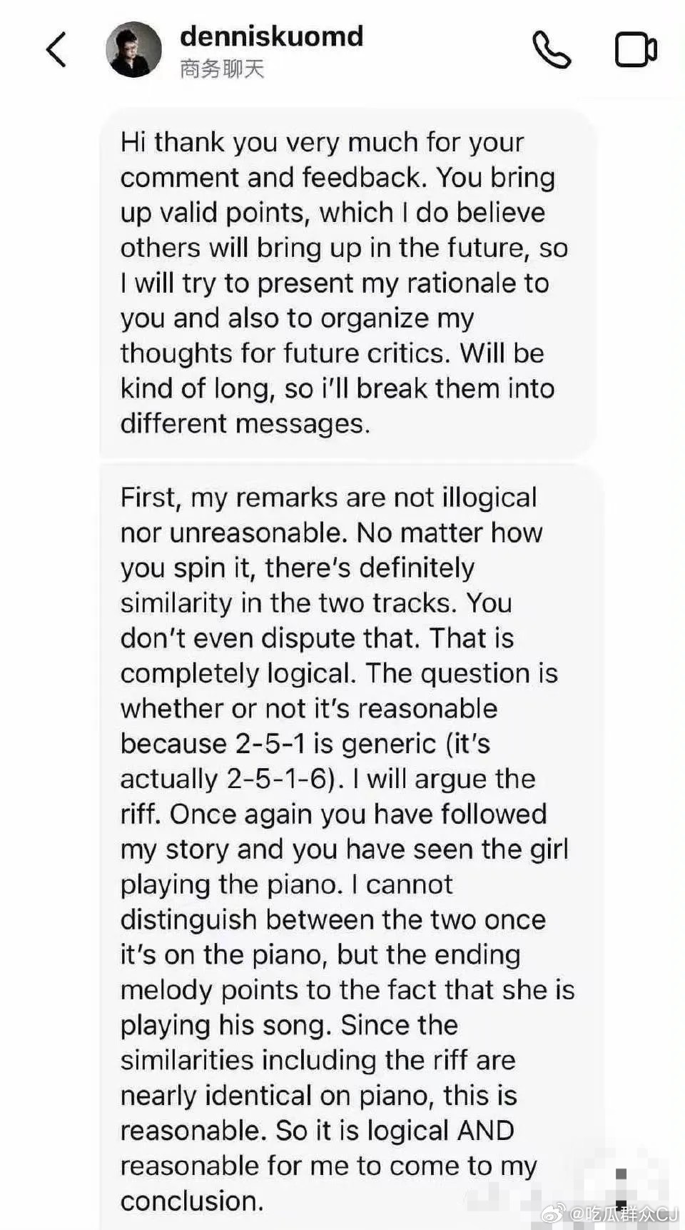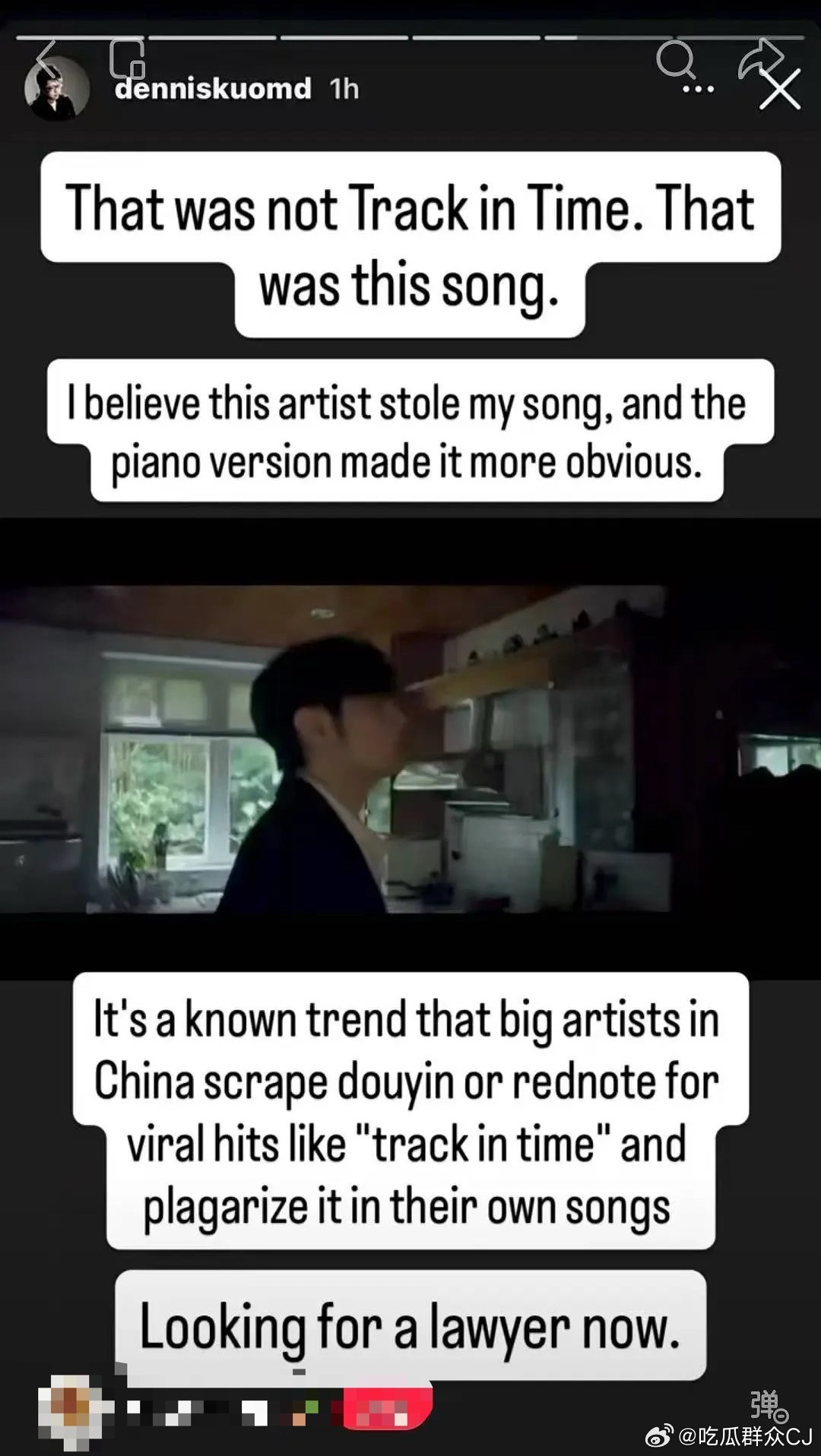 到2024年6月,李荣浩发布翻唱歌曲《恋人》,部分网友觉得这首歌听感和美籍华裔音乐人郭致君Dennis Kuo的2021年原创钢琴曲《track in time》高度相似。这种雷同和原作刘嘉星的词曲无关,而是因为李荣浩版本加了一段钢琴前奏,李荣浩版本的公开信息写明:编曲李荣浩。这件事也在近期的维权大战中被反复提及,Dennis Kuo昨天在自己的Instagram快拍转发了对比,认为《恋人》和《Track in Time》高度相似,钢琴编排让抄袭痕迹更加明显,他已经在找律师处理此事。另外一张不知出处的私信截图里,有Dennis Kuo详细论述自己如何认定抄袭的原因。对此李荣浩的回应就是前一条,由工作室出面表示和声通用、没有收到任何诉讼材料。